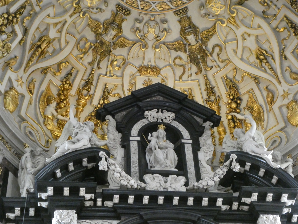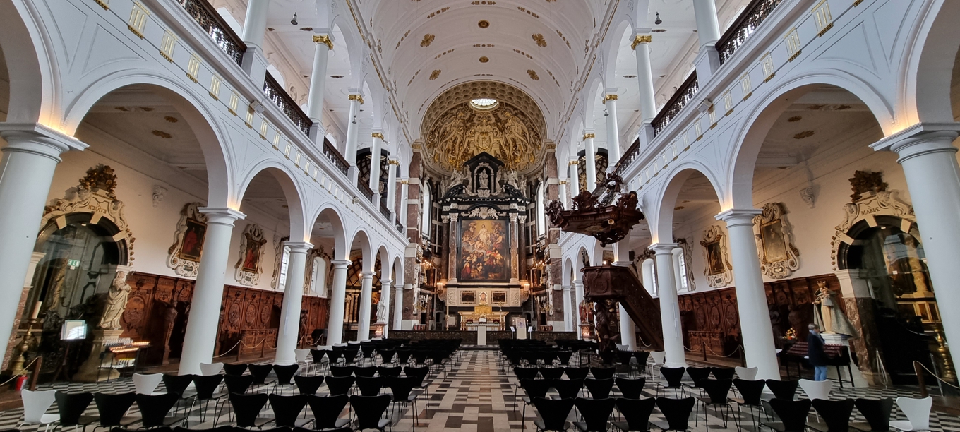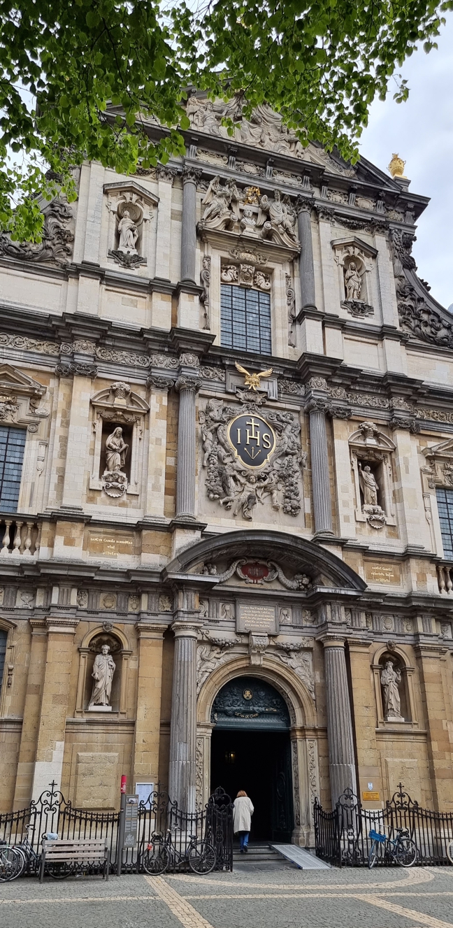 Kaffeezeit. Eher versehentlich kommen wir an einem Platz an mit einer riesigen, prachtvollen Barockkirche. Die Fassade schon beeindruckend, der Innenraum noch mehr. Er wird vor allem diejenigen begeistern, die überbordenden Barock lieben, Säulen, Stuck und Marmor, dazu monumentale Bilder flämischer Meister sowie Gestühl und feinst geschnitzte Figuren entlang der Wände. Erst spät bemerken wir, dass wir in der Karl Borromäus-Kirche gelandet sind, die zu den schönsten Belgiens zählt, die oft auch als Rubens-Kirche bezeichnet wird – von diesem stammen die Fassade und einige Gemälde, andere von bedeutenden Künstlern seiner Zeit.