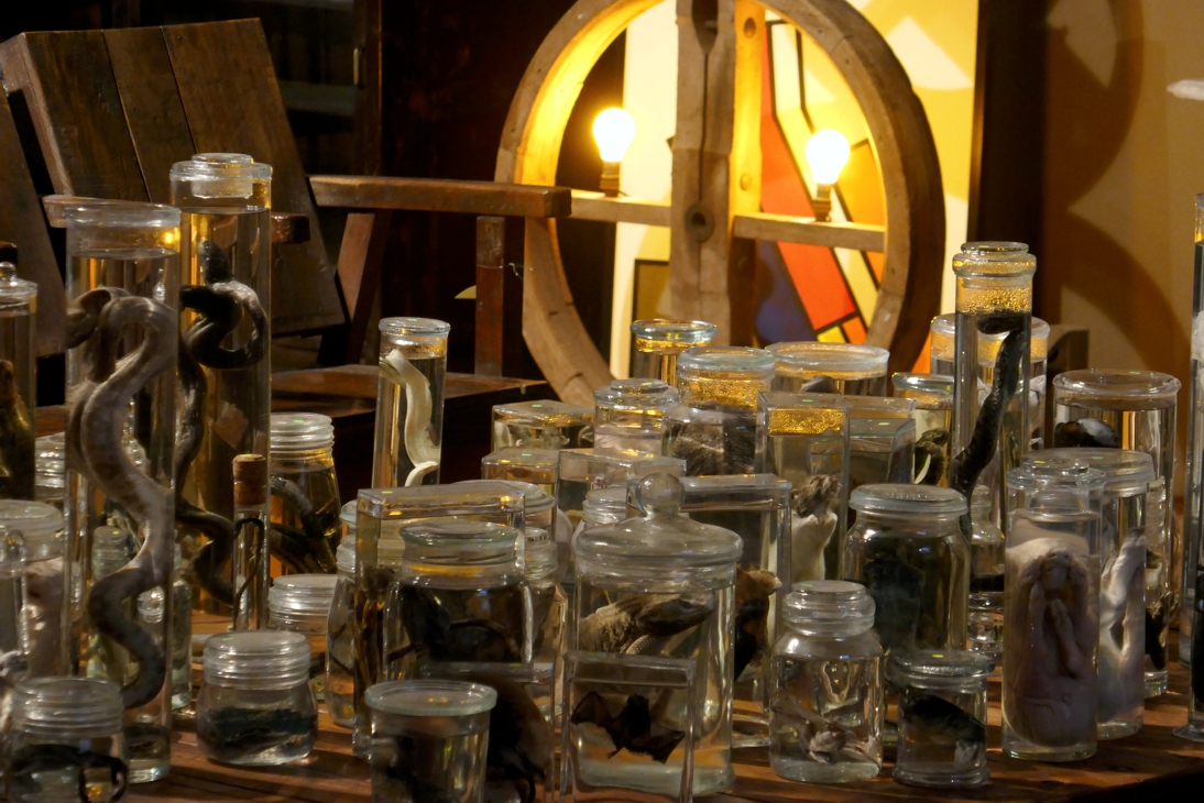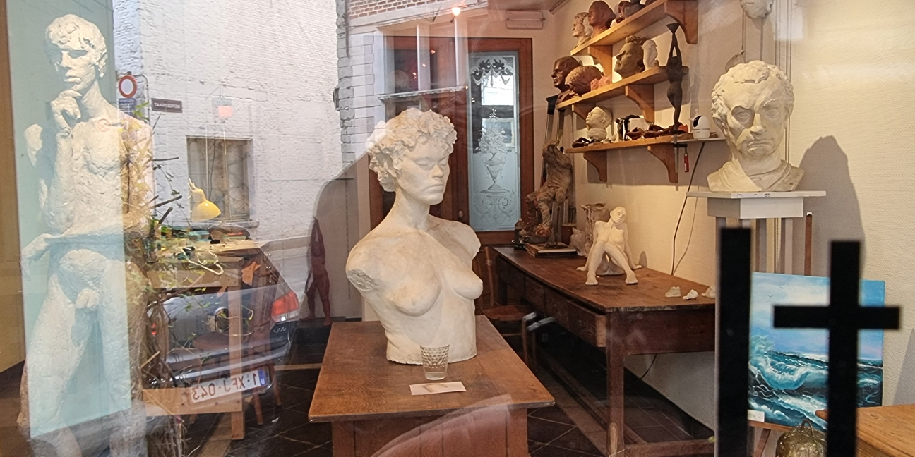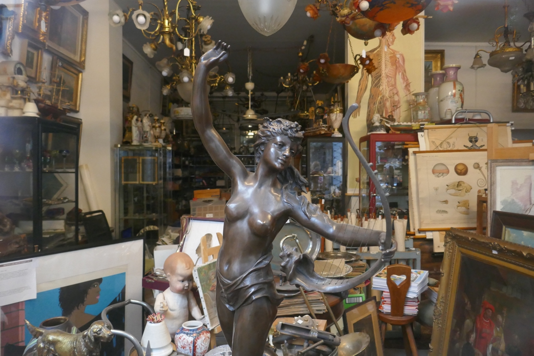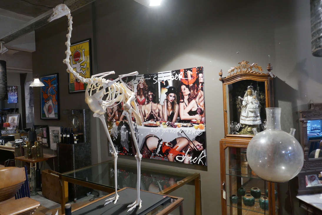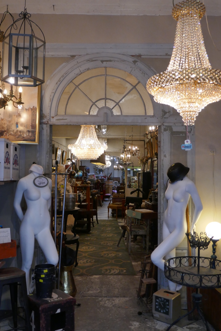 Einiges, was in den Schaufenstern zu sehen ist, eignet sich zusammen mit der Spiegelung der Gebäude von der anderen Straßenseite im Fenster hervorragend für Fotokunst, die die ausgestellten Gegenstände erst richtig wertig aussehen lässt. Was da zu sehen ist – das ist schon ziemlich ungewöhnlich. Skulpturen und Bilder, wild zusammengestellte Antiquitäten, zwischendrin auch ein Kunstwerk, bei dem man erst auf den zweiten Blick Analogien zu einem nicht unbekannten Gemälde erkennt.