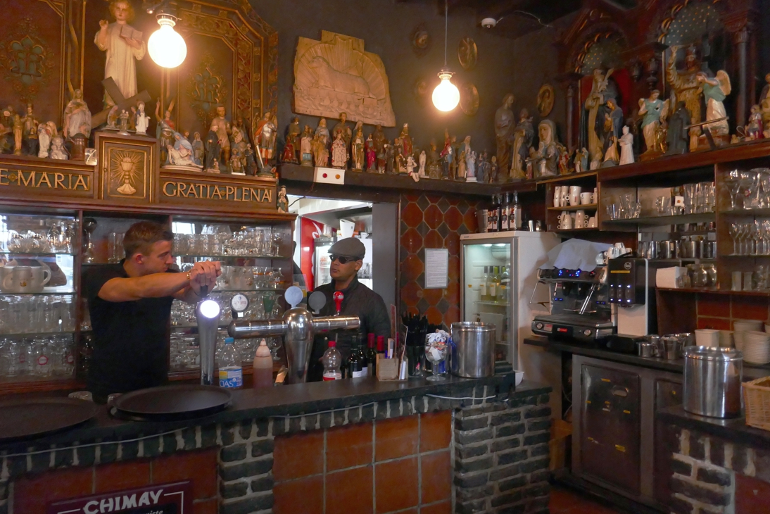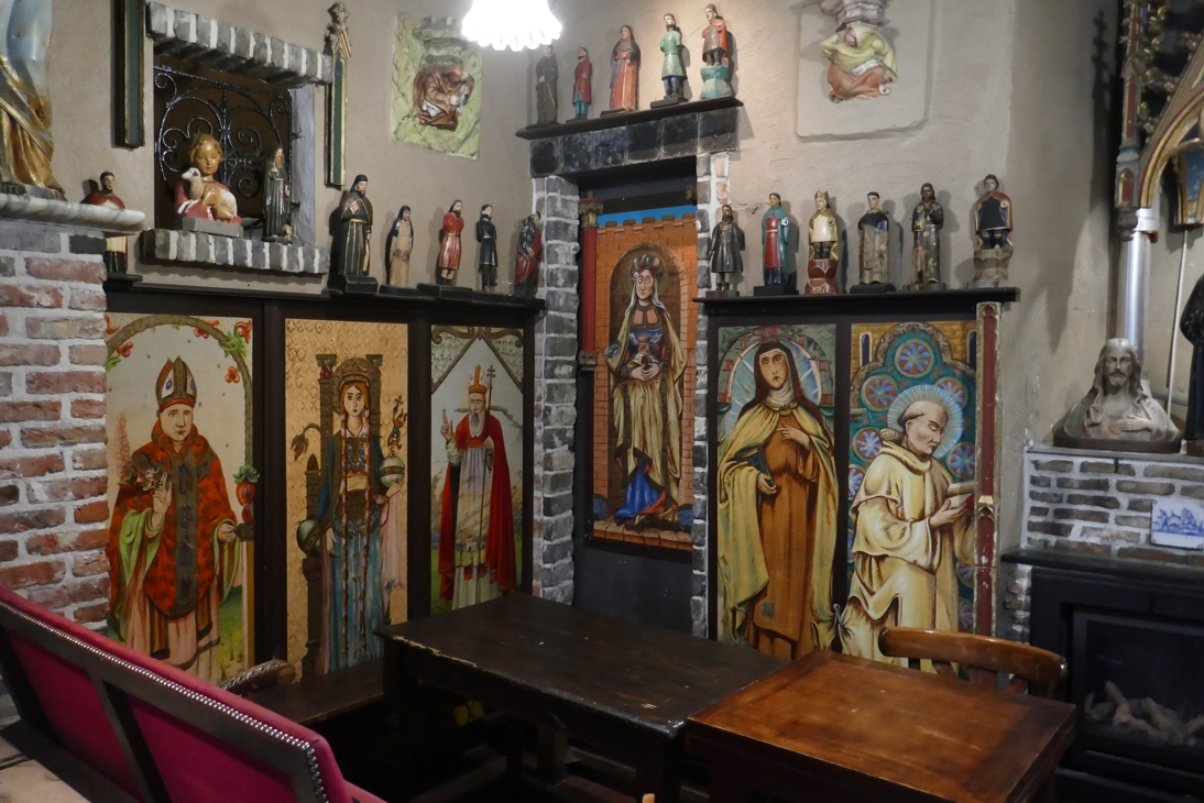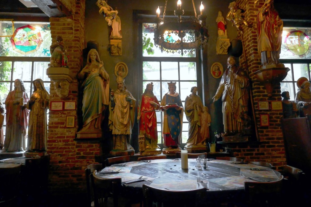 Das ist ein kleines Restaurant in einem alten gotischen Gebäude, über zwei Etagen, fast wie eine kleine Kapelle, vollgestopft mit Heiligenfiguren, bei denen man sich immer wieder fragt, wie viele mittelalterliche Kirchen dafür „geplündert“ werden mussten, dazwischen Tische und Stühle, und es gibt ein hervorragendes Essen.