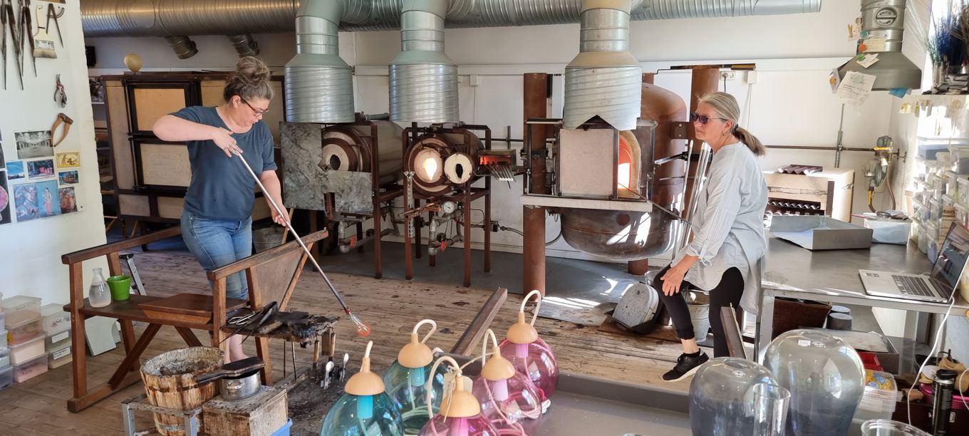 Weiter geht es auf unserem Spaziergang durch die idyllische Dorfstraße, vorbei an kleinen Cafès, wo wir natürlich auch eine Pause eingelegt haben, dabei ein leckeres, aber eigentlich viel zu süßes, fast schon klebriges Eis gegessen haben. In einem der Reetdachhäuser ist eine Glasbläserei, die Glaspusteri, in der gerade Vasen entstehen; kunstvoll, all die Produkte, die hier zu sehen sind, und vor allem sehr farbenfroh.