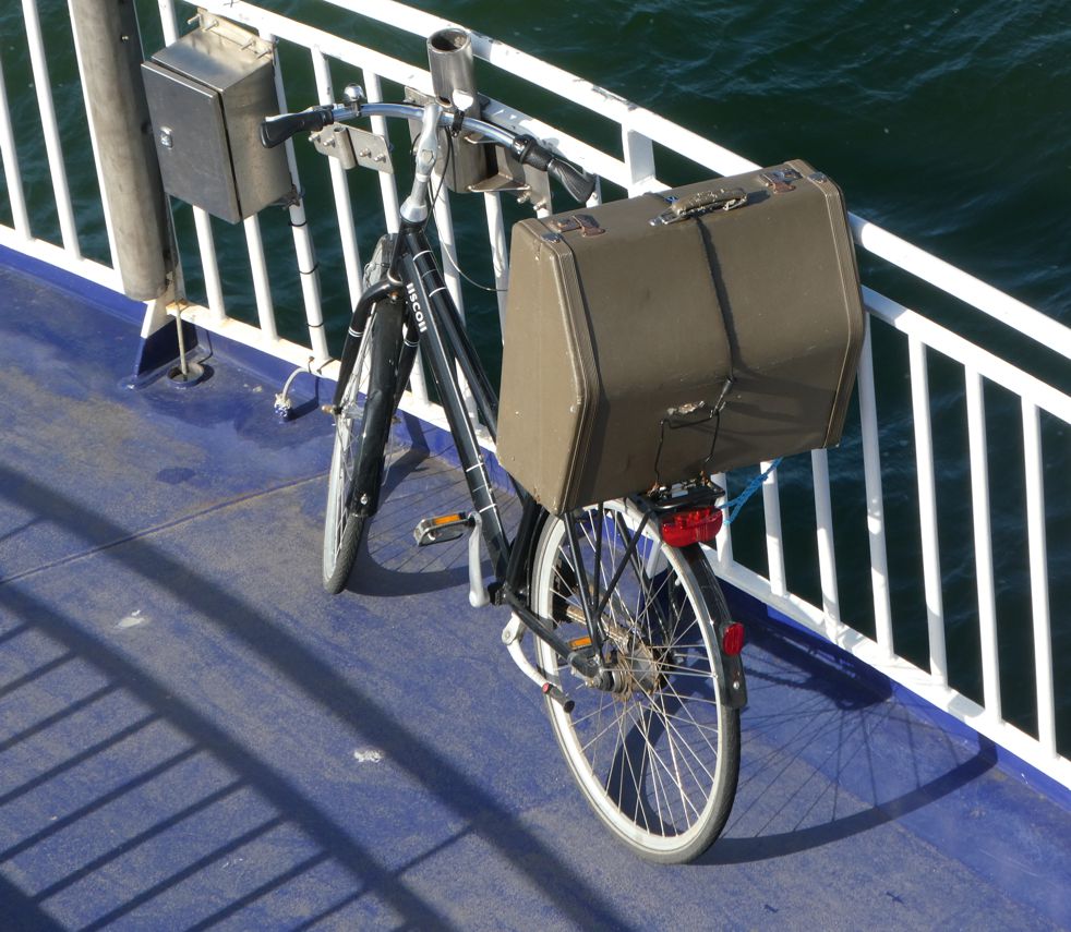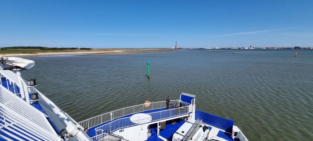 Die Fähre zur Insel ist hoch gebaut; oben steht man wie auf einer Aussichtsplattform, kann auf der einen Seite einen Teil der Stadt überblicken, auf der anderen einen ziemlichen Teil der Insel, die flach im Wasser liegt.