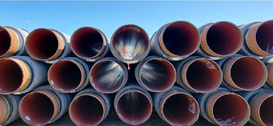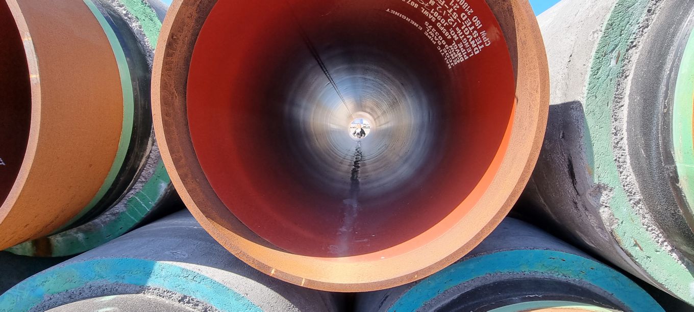 Auf dem Hafengelände gleich beim Schiff sind Stahlröhren zur Verschiffung gelagert, die bedingt durch Aufschichtung, Farbmarkierungen und Stahlglanz wie eine Installation moderner Kunst anmuten.