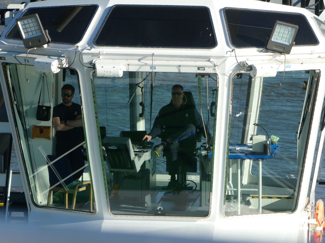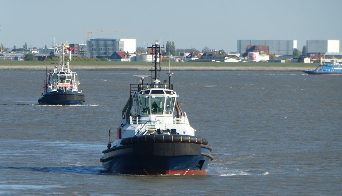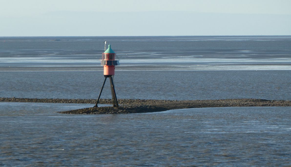 Im Hintergrund sind die Trockendocks der Lloyd Werft zu sehen; hier liegen zwei Schiffe von AIDA, die gerade überarbeitet werden. Begleitet von zwei Schleppern geht es hinaus aus der Wesermündung, vorbei an den letzten Leuchtfeuern.