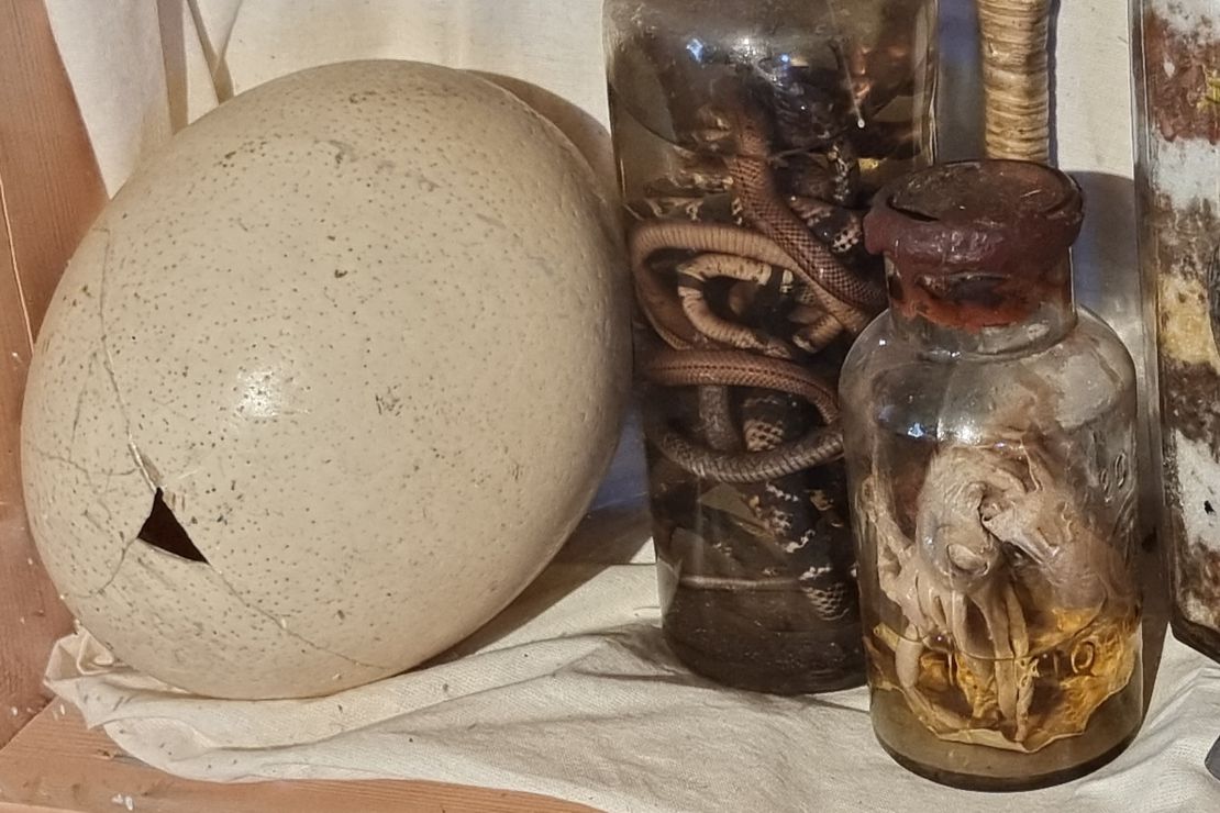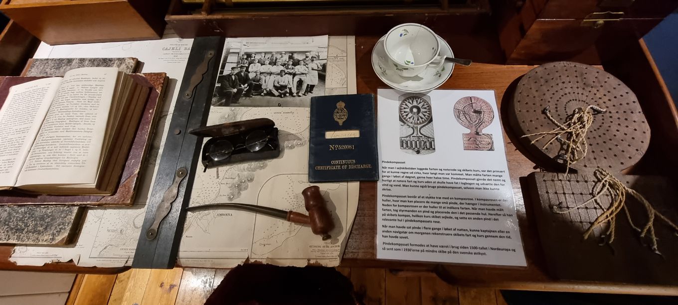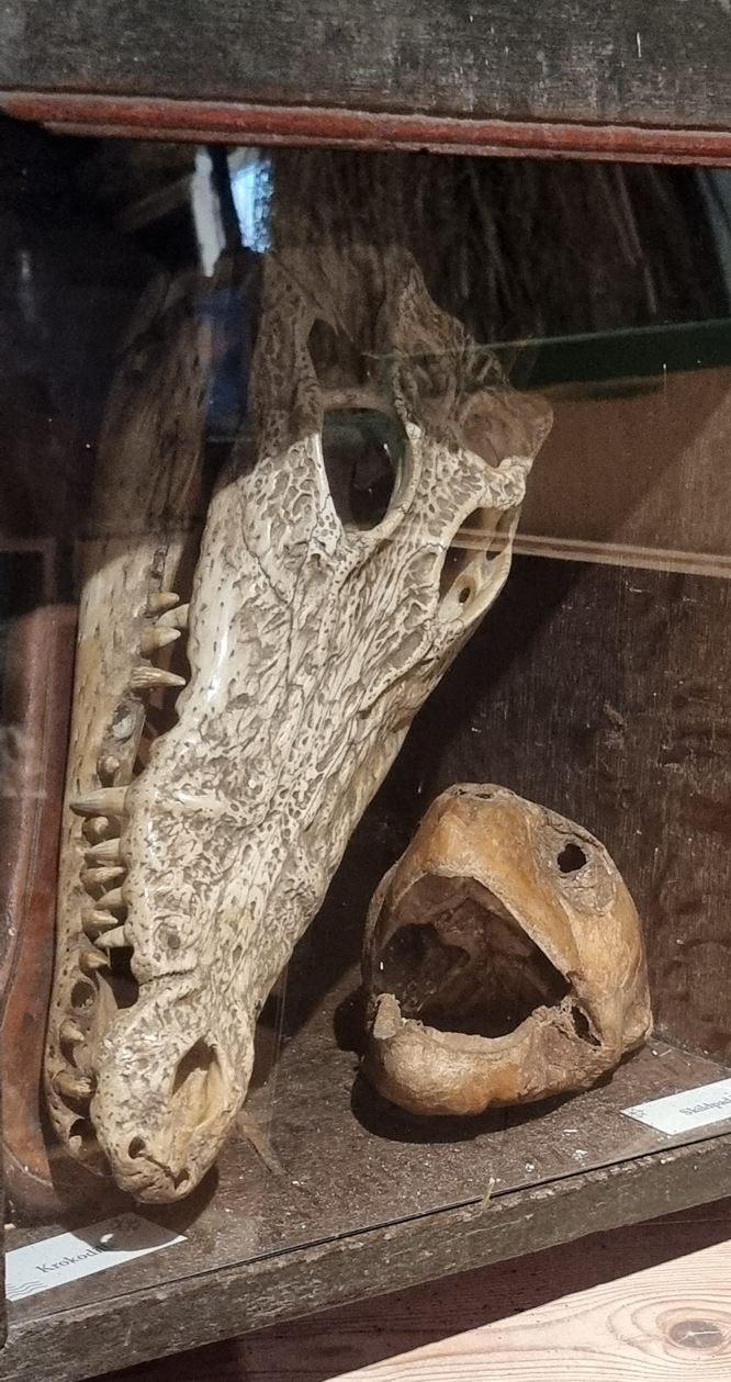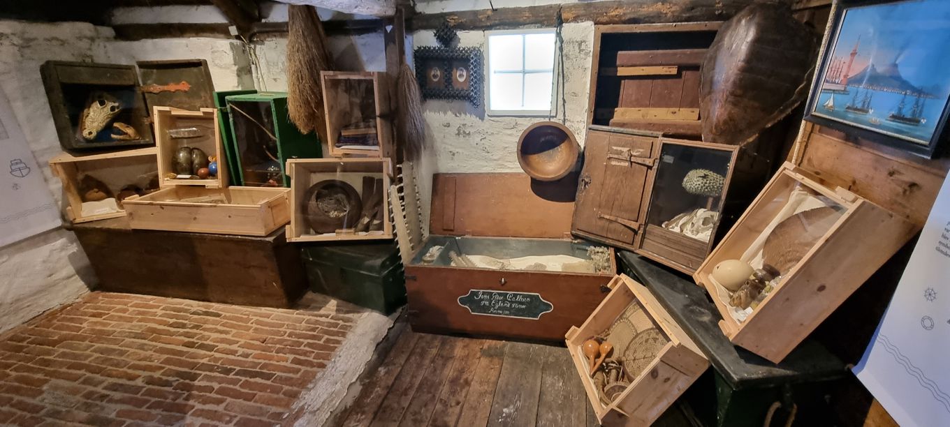 Erstaunlich, was hier in dem kleinen Museum noch alles an Seefahrerutensilien und an Reisetrophäen aus vergangenen Jahrhunderten zusammengetragen worden ist – ein „Pindekompass„, wie immer der auch funktionieren mag, Ausweise und alte Seekarten, ebenso wie Straußeneier, ein Krokodilschädel, Schwertfisch-Schwerter, eingelegte Schlangen und Skorpione, eine Nuss der Coco de Mer, die Seychellen-Kokosnuss, getrocknete Fischmäuler, eben alles, was als Mitbringsel Aufmerksamkeit bringen konnte, und natürlich auch allerhand Alltagsgegenstände aus dem Leben der Seeleute.