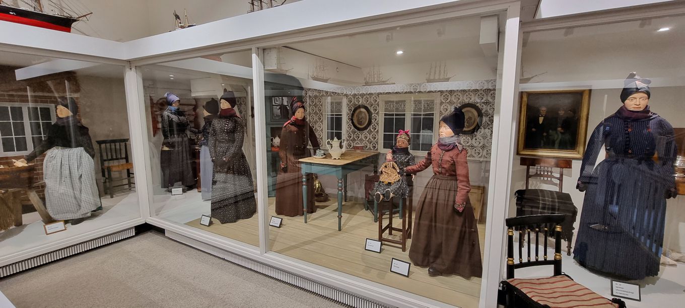 Die Infoseiten, die man in die Hand gedrückt bekommt, erzählen von der Familie, die hier gewohnt hat, zunächst noch mit Segelschiffen unterwegs war, dann mit Dampfern. Berichtet wird vom Alltagsleben, von den sogenannten Besuchs-Ehen, da die Männer oft nicht nur monatelang, sondern gar jahrelang auf See unterwegs waren, auch von der Gesellschaft der Witwen, genau geregelt, da ja meist nicht nachvollzogen werden konnte, nach wie langer Zeit, wann und wo die Männer abblieben. Mit Trachten wurde für alle erkennbar gezeigt, ob eine Frau unverheiratet, verheiratet, verwitwet oder vielleicht auch verwitwet „im Wartezustand“ war – gewartet werden musste drei Jahre, bis ein nicht wiedergekommener Mann für tot erklärt werden und die Frau das Erbe antreten konnte.
