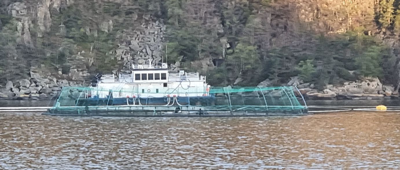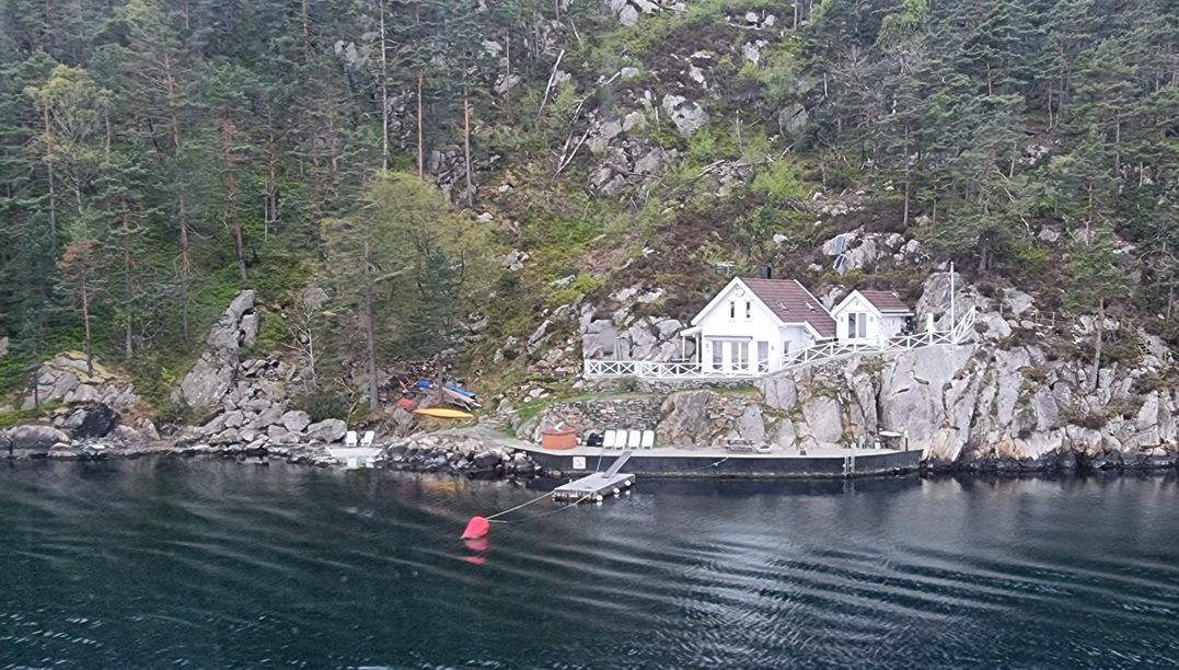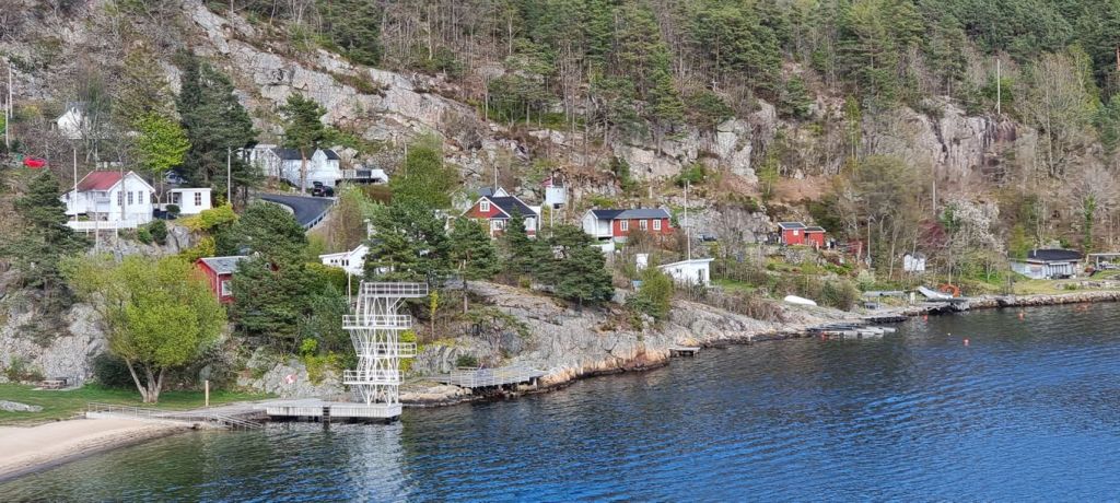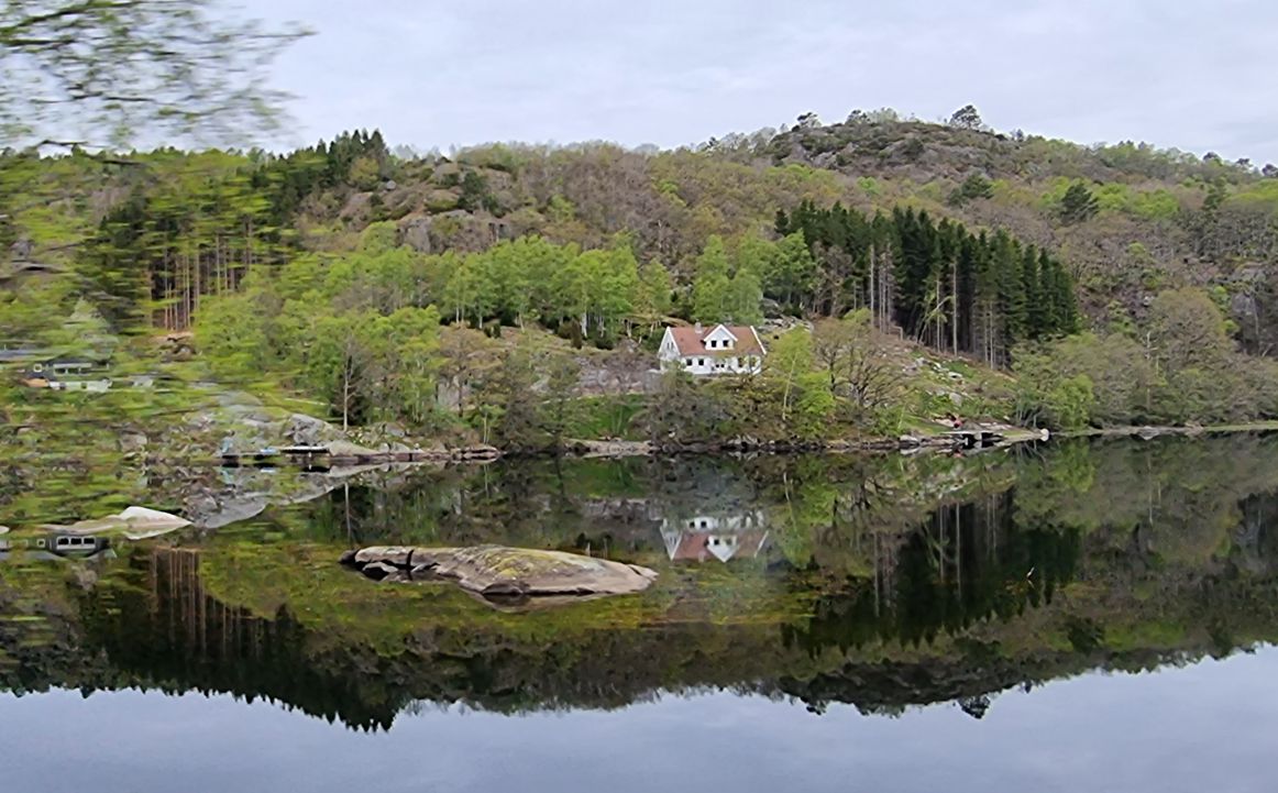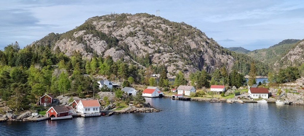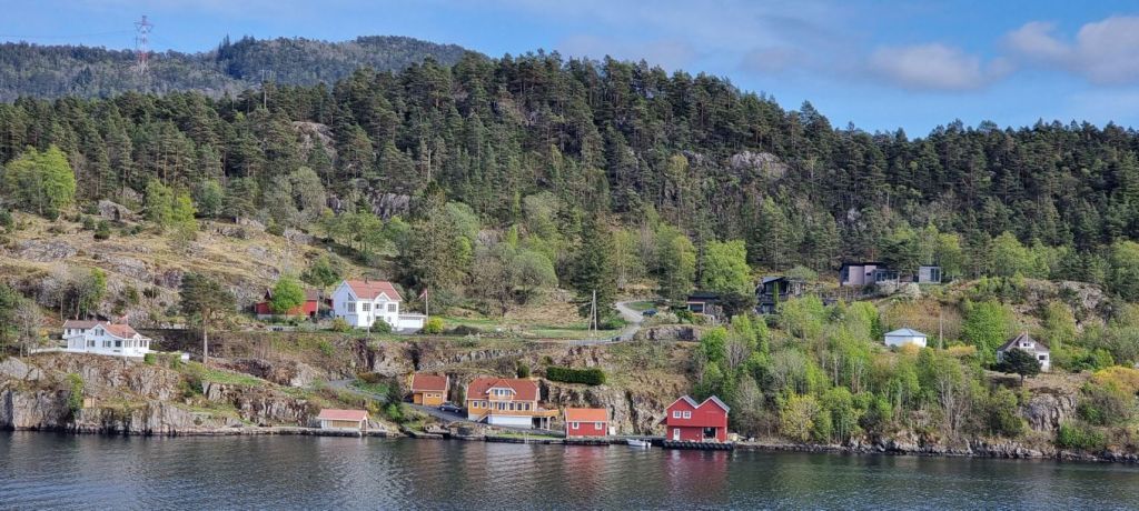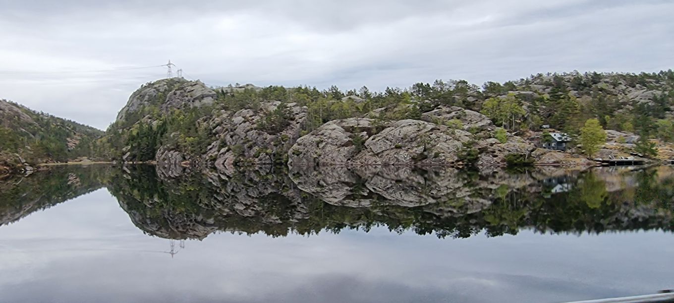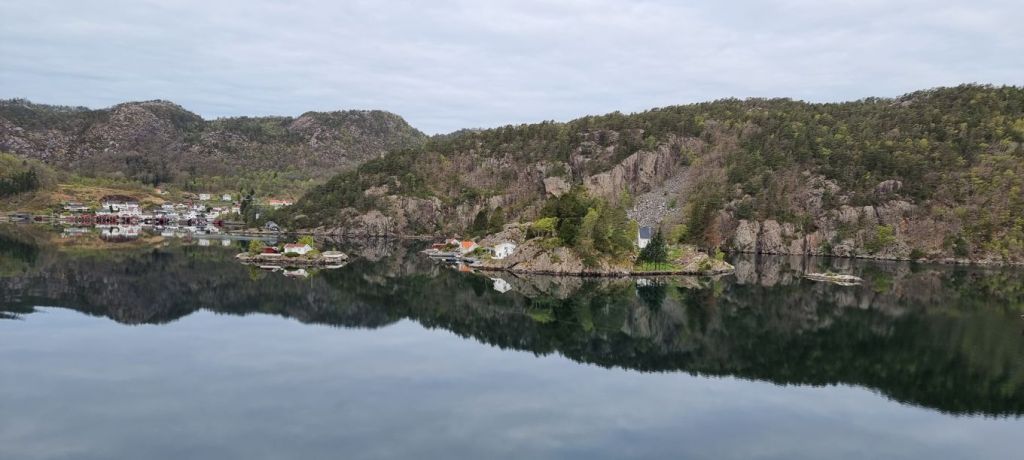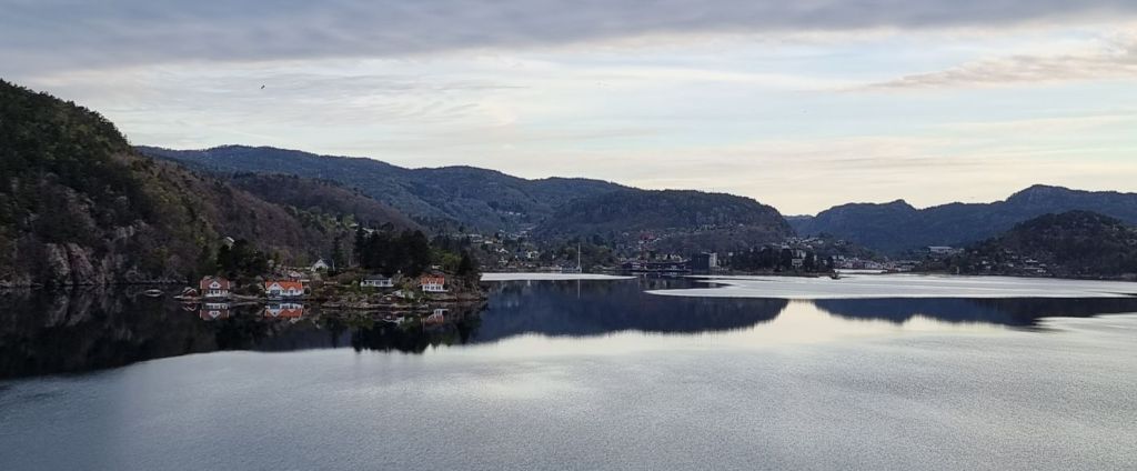 Die Fahrt führt durch einige kleine Fjorde hindurch, deren Namen eher unbekannt sind. Im Eingangsbereich zum Flekkefjord sind mehrere Lachsfarmen zu sehen. Noch blitzt immer mal wieder die Morgensonne durch, und die Landschaft spiegelt sich im ruhigen, dunklen Wasser.