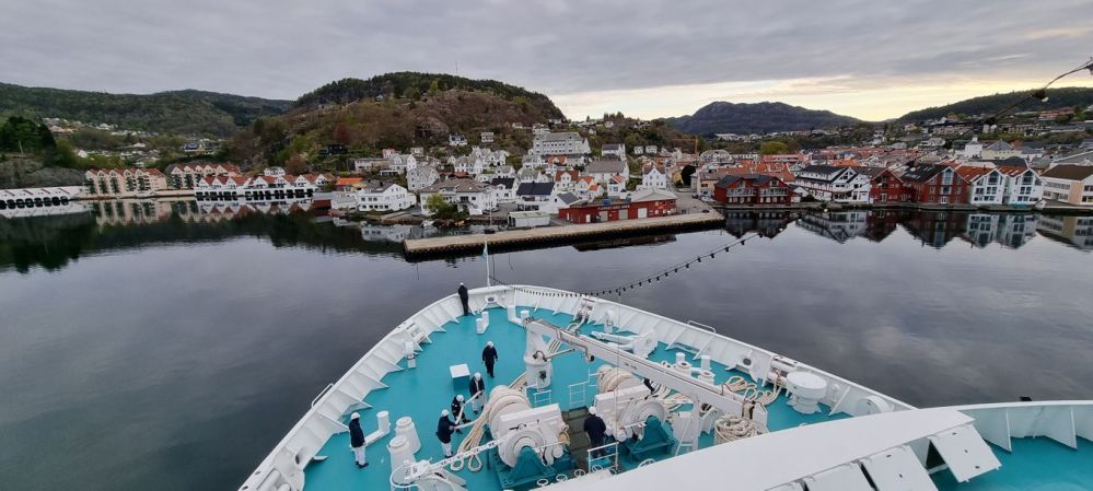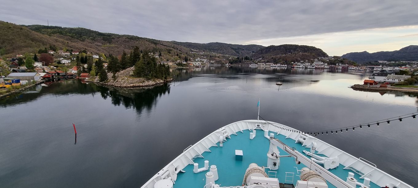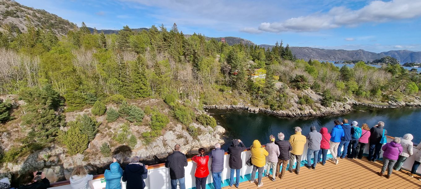 Zwischen ein paar Schäreninseln geht es am frühen Morgen mit der MS Deutschland in den Rosfjord hinein, von dort aus weit ins Landesinnere, zum Flekkefjord, der nur mit sehr kleinen Kreuzfahrtschiffen angefahren werden kann.