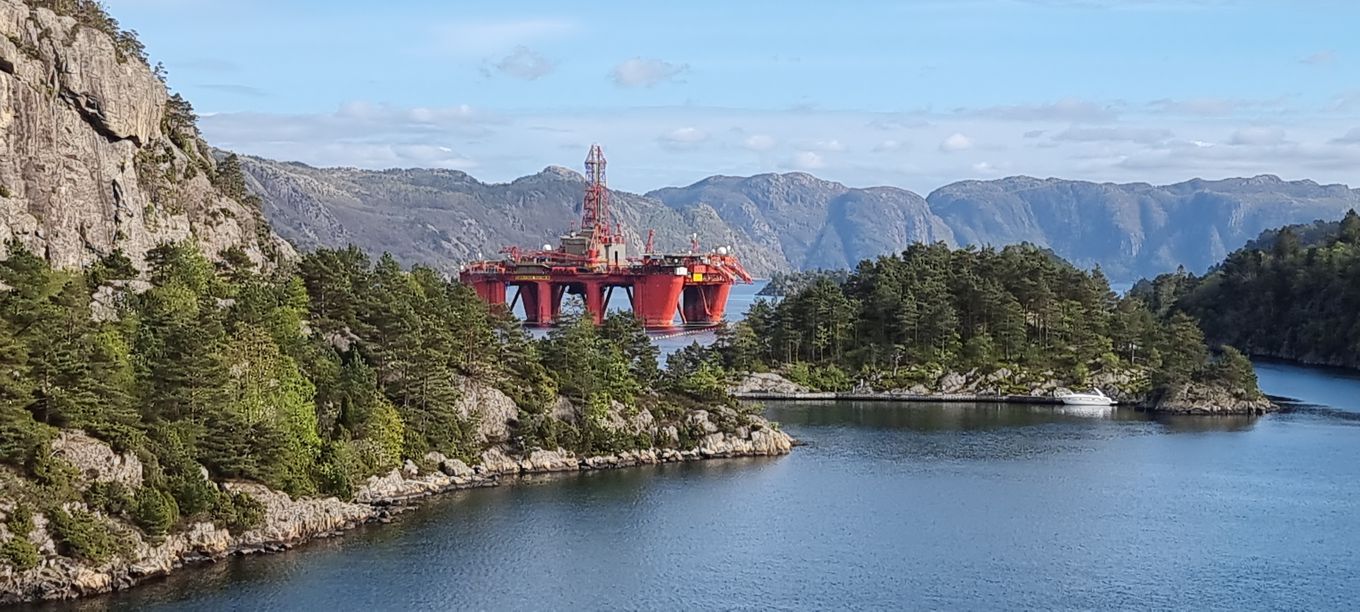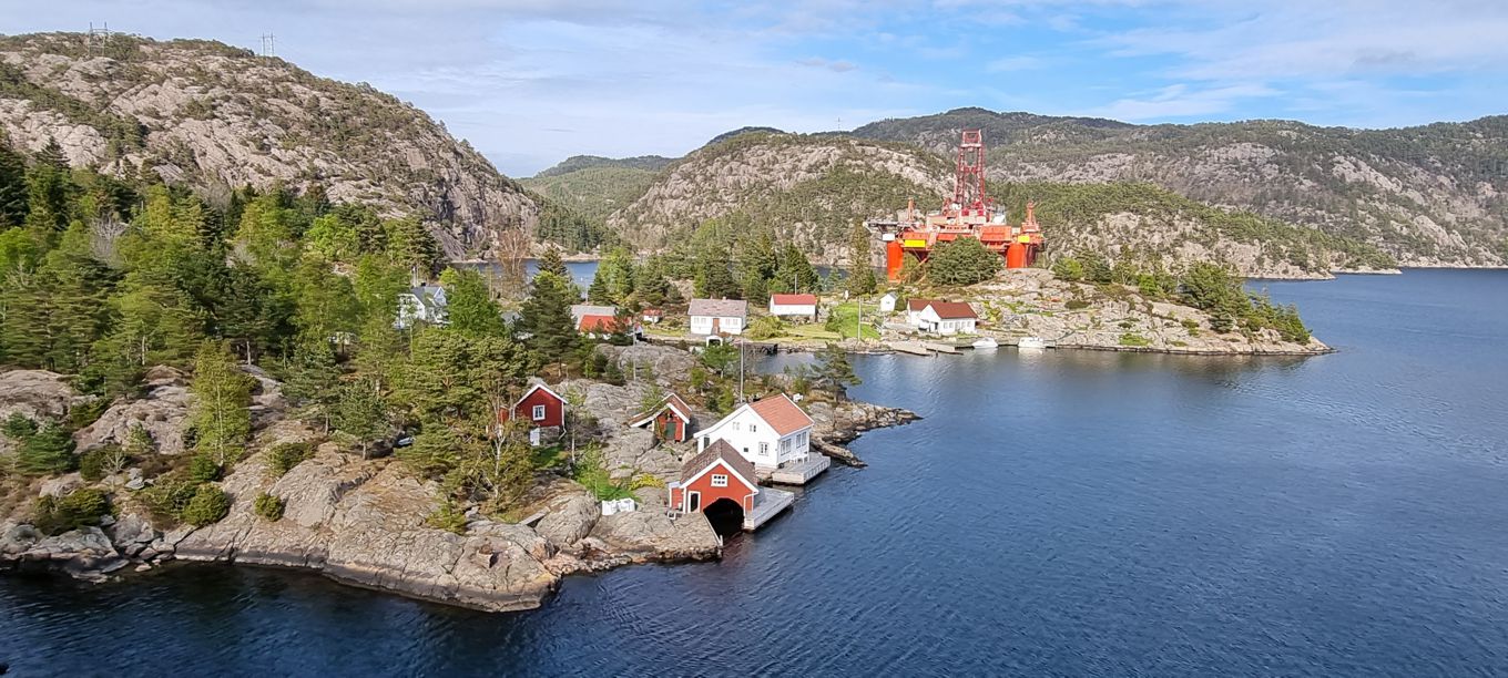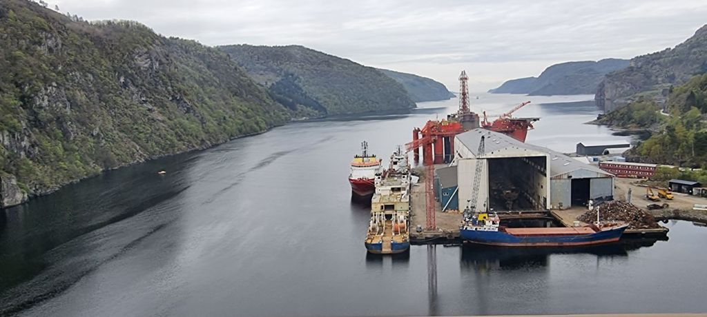 Immer wieder geht die Fahrt über einen kleineren Fjord hinüber; ein mal ist von hoch oben eine Werft zu sehen, in der an einer Ölplattform gearbeitet wird.