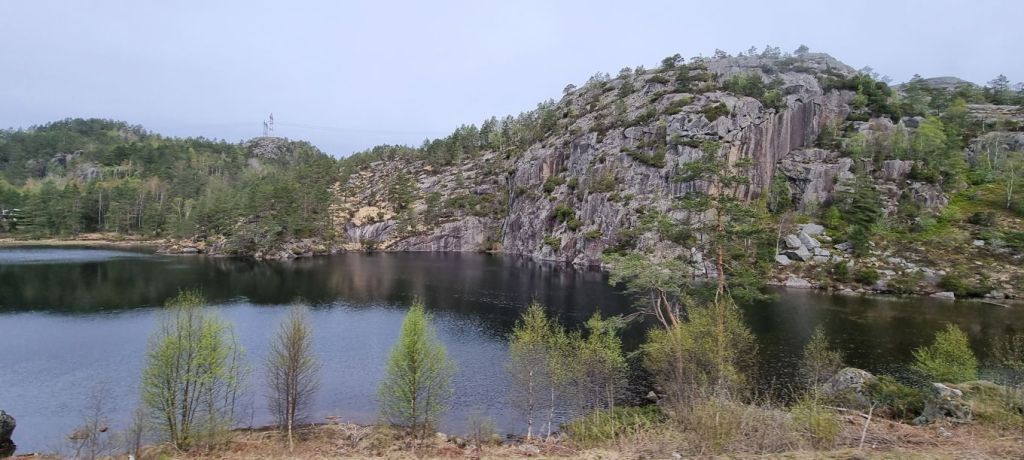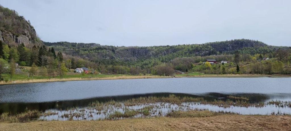 Während der Fahrt stellen wir fest, dass wir drei völlig unterschiedliche Gebiete durchfahren – gestartet sind wir in der typischen Fjordlandschaft mit den steilen, oft schroffen Felsformationen und kleinen, engen Tälern, dann die felsig-waldigen Höhenlagen.
