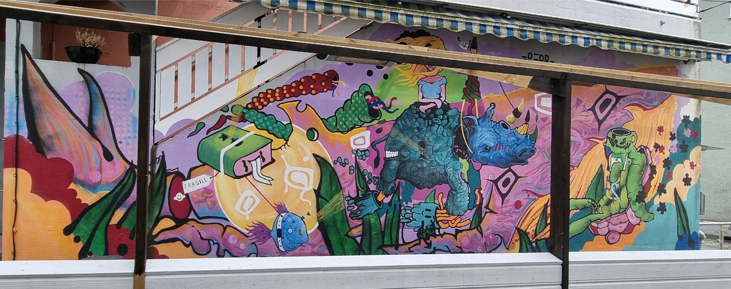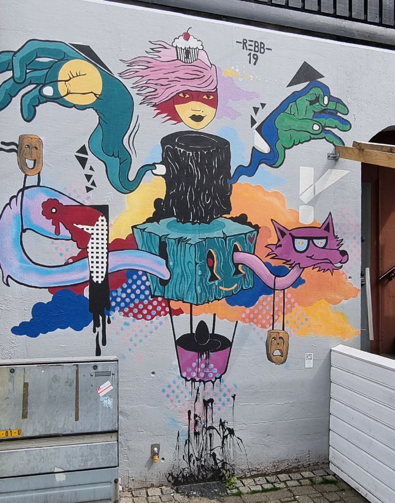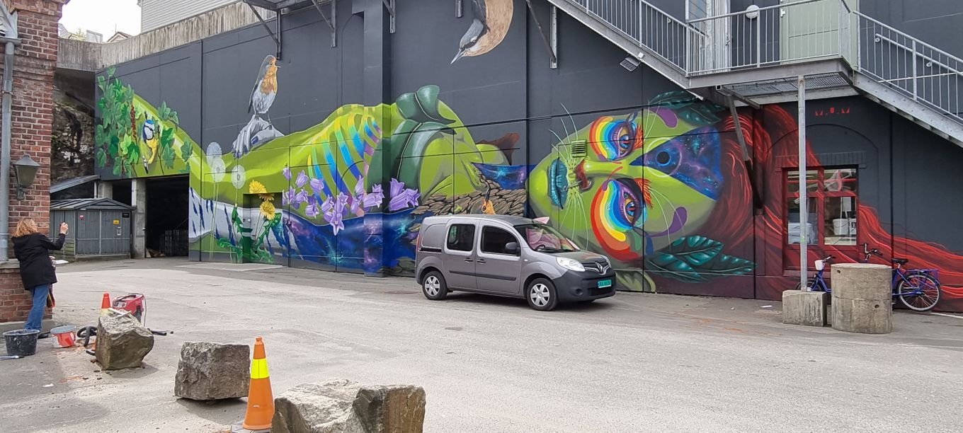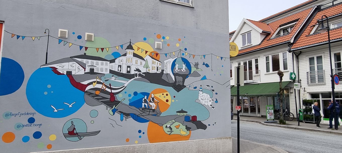 Entlang der Straße entdecken wir einige Graffiti, für die Flekkefjord bekannt ist – man könnte sich auch auf den Weg auf eine vom Tourismusbüro angebotene Wegstrecke mit Sehenswürdigkeiten des Ortes kombiniert mit besonders schönen Graffitis begeben.