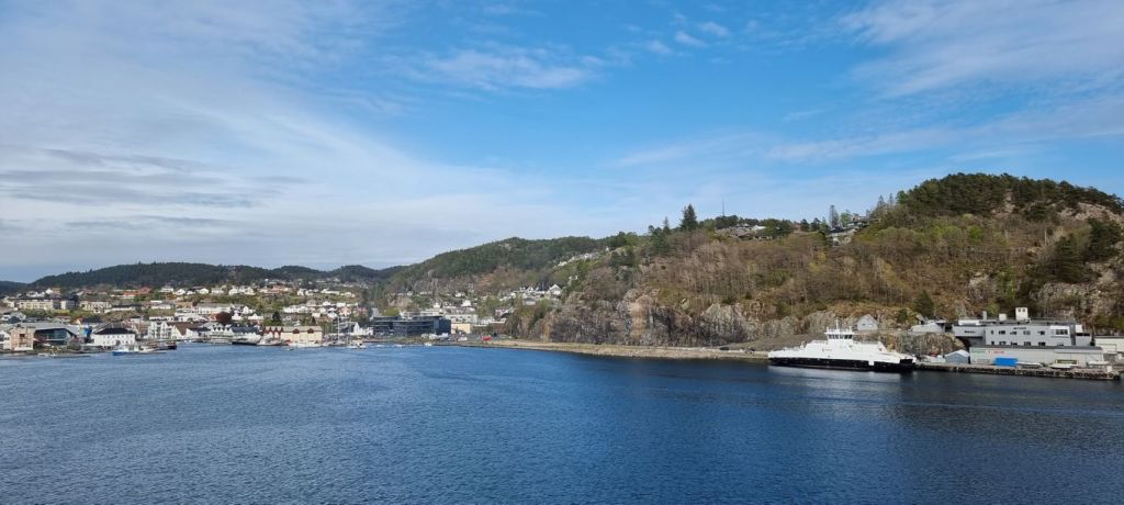 Wetterumschwung in Norwegen. Losgefahren in Esbjerg bei strahlendem Sonnenschein, jetzt an der Küste Norwegens wird es ziemlich kalt. Am Himmel stehen dicke Wolken, es fällt etwas Regen und tatsächlich fallen zwischendurch auch mal einige Schneeflocken auf das Deck.