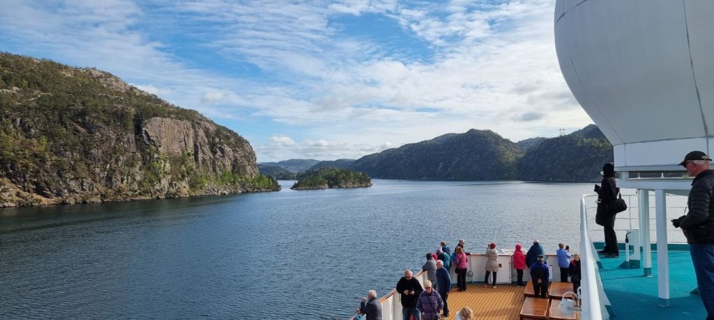 Wie eng es im Fjord für ein Schiff werden kann, bekommen wir besser als bei der Einfahrt dann bei der Ausfahrt am späten Nachmittag mit, weil das Wetter so ist, dass man sich gut draußen an Deck aufhalten und alles beobachten kann.
