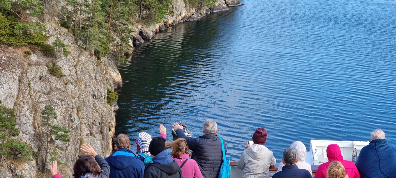 Einige Stellen sind unglaublich eng, so dass der Eindruck entsteht, man könne mit den Händen fast die Felswände erreichen. Ein kleines Boot, das entgegen kommt, fährt so nahe an der Bordwand der MS Deutschland entlang, dass man den Eindruck hat, als wolle es am Schiff anlegen, wie es sonst die Lotsenboote tun.