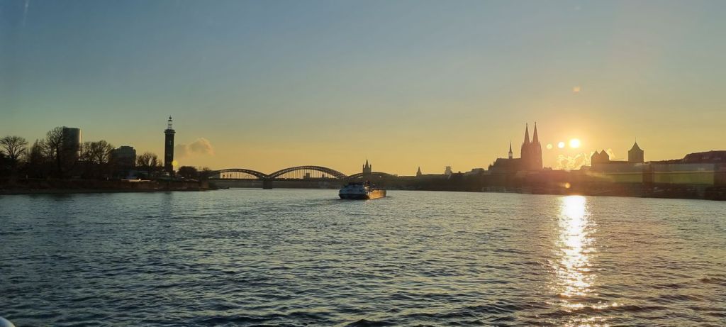 Start und Ziel unserer Winterkreuzfahrt mit dem Flusskreuzfahrtschiff, der MS Andrea von Phoenixreisen, ist Köln. Am späten Nachmittag geht es los. Als das Schiff dreht, ist aus der Panoramalounge heraus, hinweg über das vordere Außendeck, die Stadt in Sicht, herausragend der Dom.
