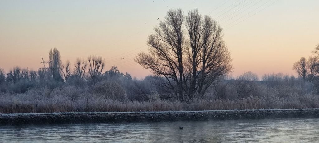 Die MS Andrea fährt über Nacht nach Rotterdam. Draußen ist es empfindlich kalt; am Morgen sind die Ufer wie weiß gezuckert, gefrorener Tau allenthalben.