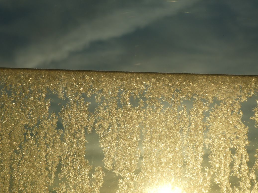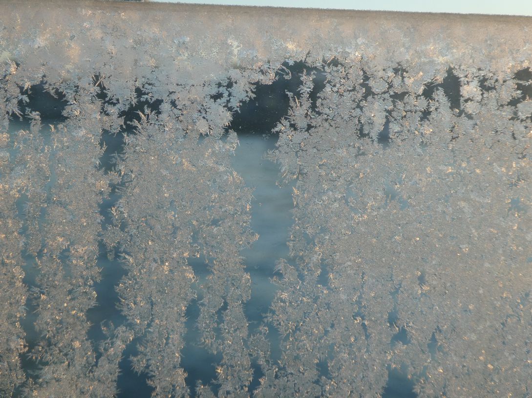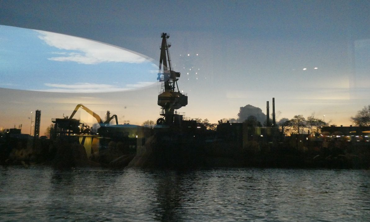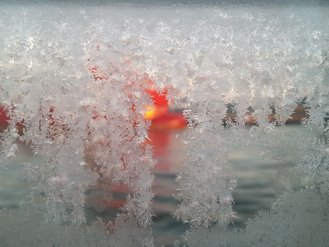 Wie immer geht es im Stadteingangsbereich vorbei an den Werften und Anlegern, irgendwann an der Arche, von deren Heck aus die Giraffe wie seit Jahren auf die Szenerie rundum blickt. Die Verglasung des Balkongeländers unserer Kabine auf der MS Andrea zeigt dazu ein silbern glitzerndes Frostblumenmuster, das in Richtung Sonnenaufgang zu gold glänzend wechselt.