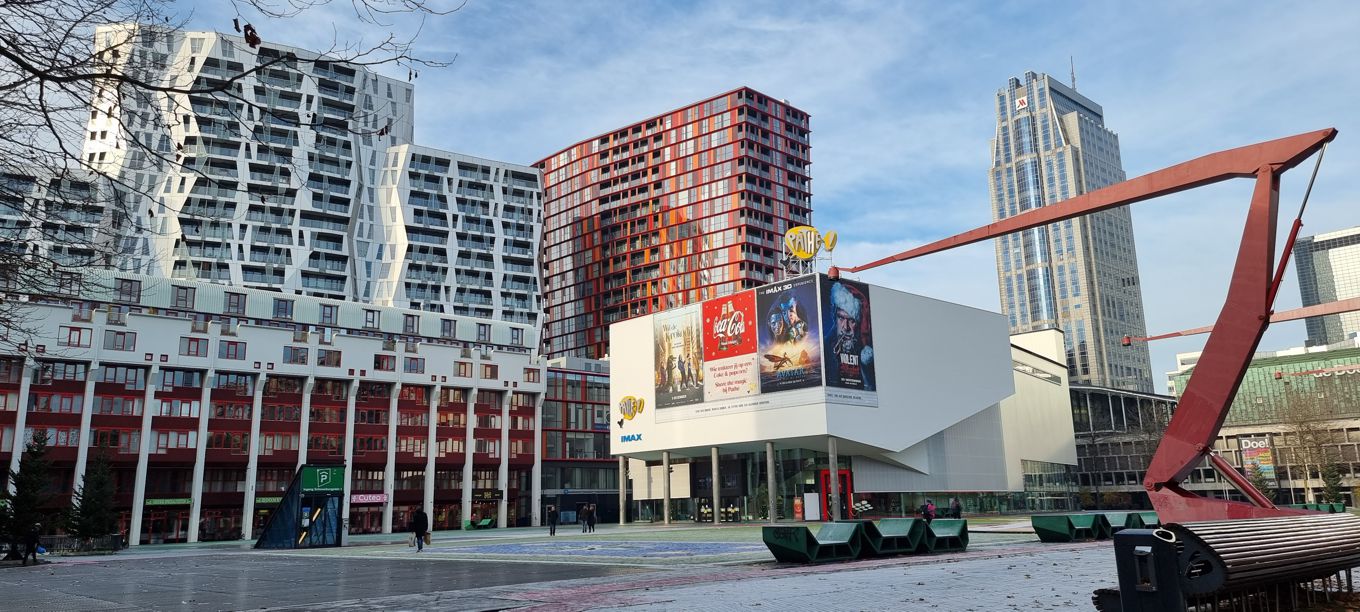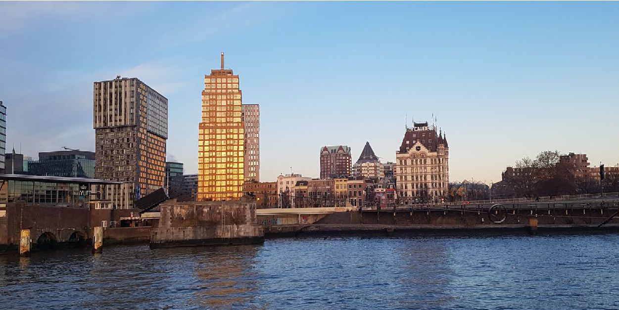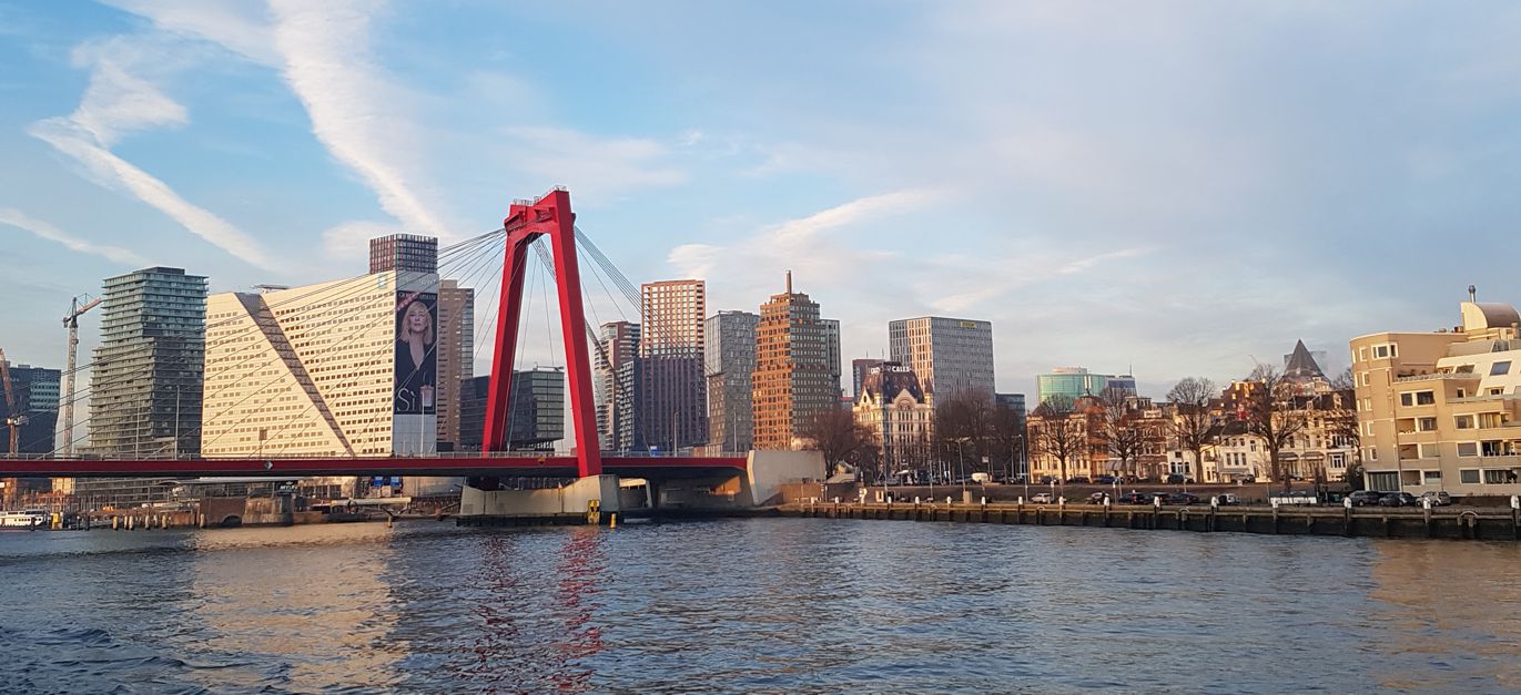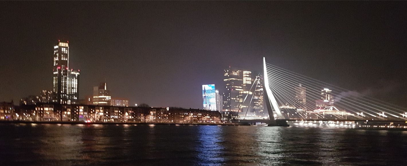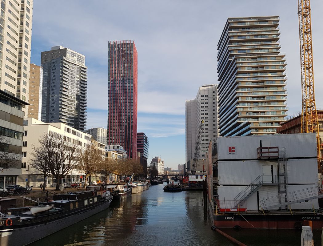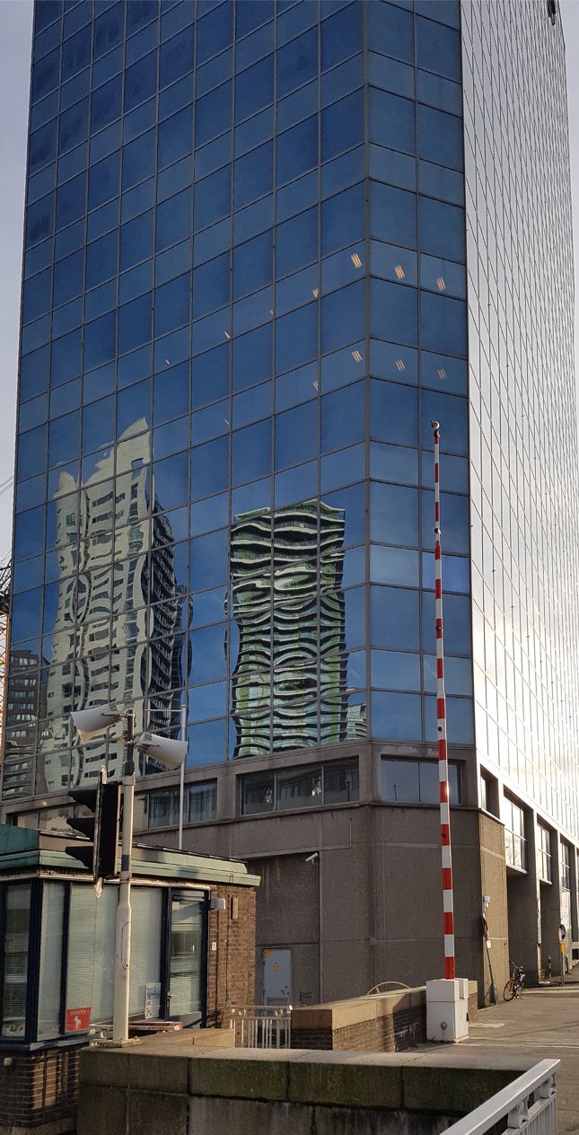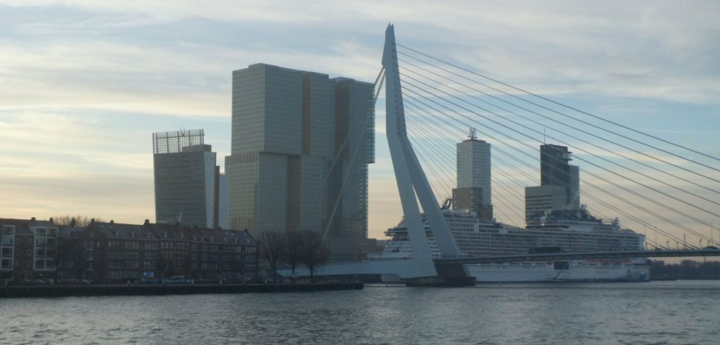 Auf der Landzunge uns gegenüber, hinter der Erasmusbrücke, stand noch vor wenigen Jahren ziemlich einsam eines der wenigen älteren Gebäude Rotterdams, das Hotel New York, das Gebäude, in dem einst die Überseeschiffe der Holland America Line abgefertigt wurden, jetzt ein Restaurant und Hotel. Es war fast verschwunden hinter den Hochhäusern, die in den letzten Jahren in diesem Bereich entstanden. Jetzt steht auch noch für einen Tag geparkt eines der riesigen Kreuzfahrtschiffe davor, im Gegenlicht leider kaum zu erkennen, etwa 20 Etagen hoch und über dreihundert Meter lang – hinter diesem sind nunmehr nicht nur das Hotel, sondern auch die kleineren Hochhäuser versteckt, nur die wenigen höheren ragen wie überdimensionale Schornsteine über das Schiff hinaus.