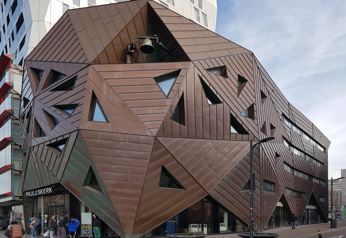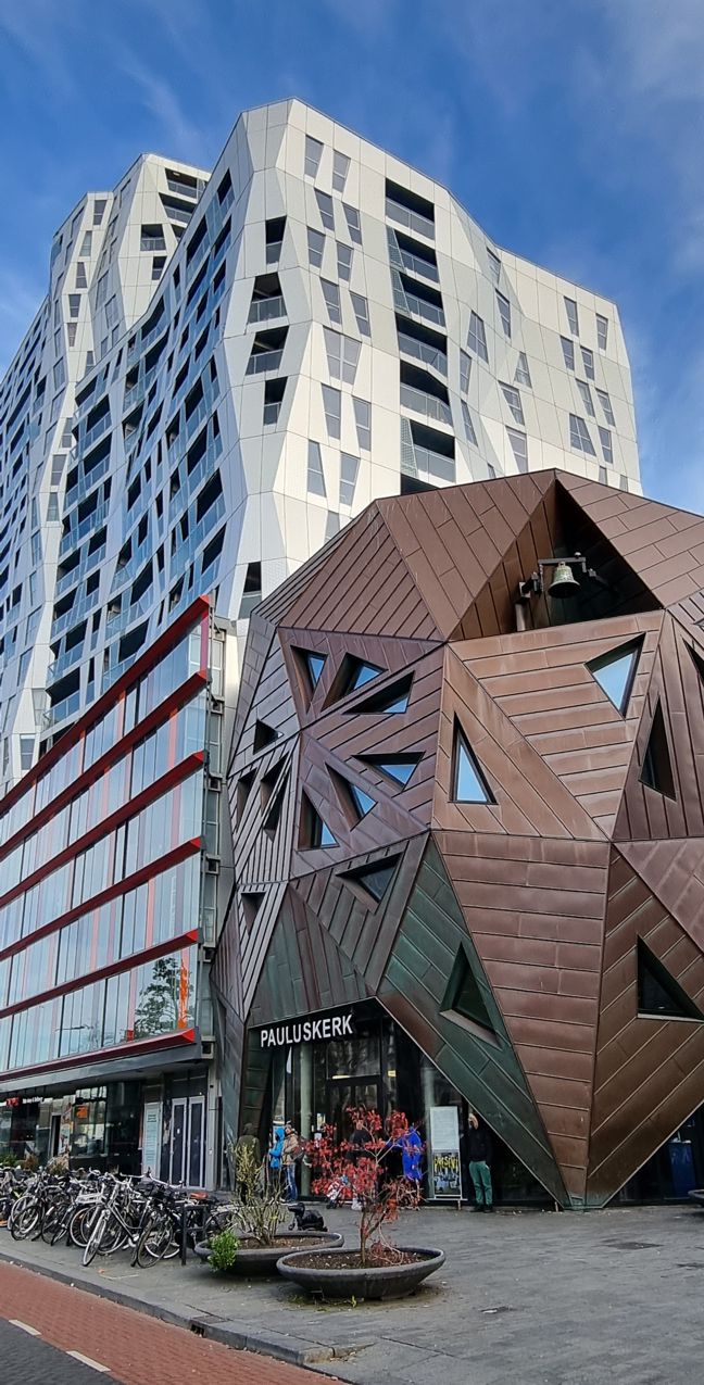 Eine Straße weiter, integriert in einen der Neubaukomplexe, liegt die Paulskerk, so ziemlich einer der ungewöhnlichsten und modernsten Kirchenbauten, die man sich vorstellen kann – und zugleich eine Kirche mit einem Konzept, wie man es eigentlich von Kirchen erwartet. Vor der Tür und im Foyer stehen offensichtlich bedürftige Menschen, wie es aussieht viele Obdachlose. Wir lesen nach, dass die Paulskerk ein Zentrum ist für alle Menschen in Rotterdam und Umgebung, die ohne Hilfe nicht auskommen: Obdachlose, Süchtige, Menschen ohne gültige Aufenthaltspapiere – Ziel, die Verbesserung der Lebenssituation für diese Menschen.