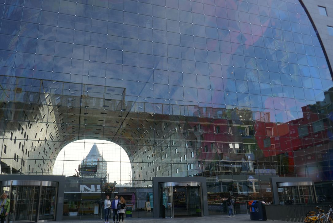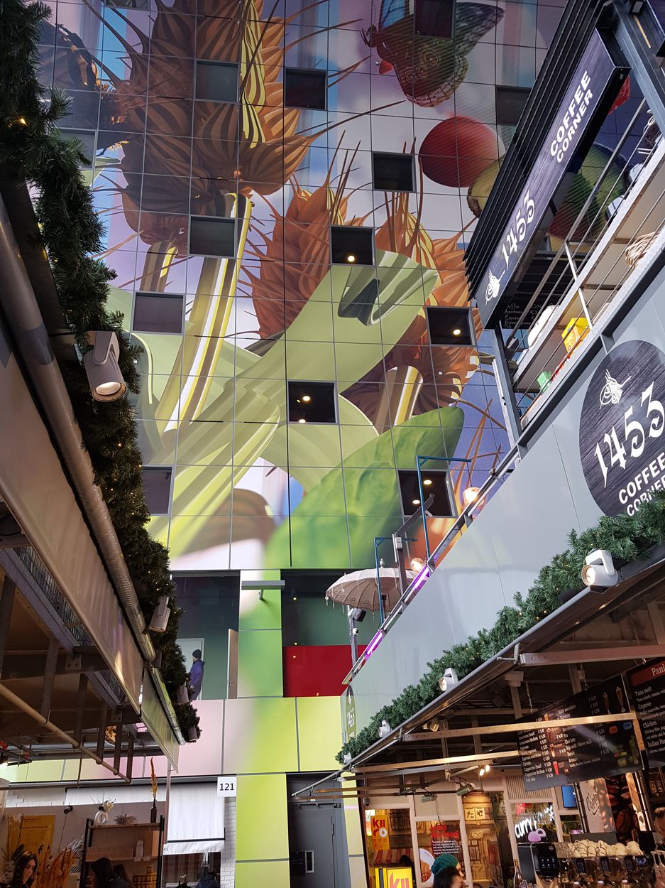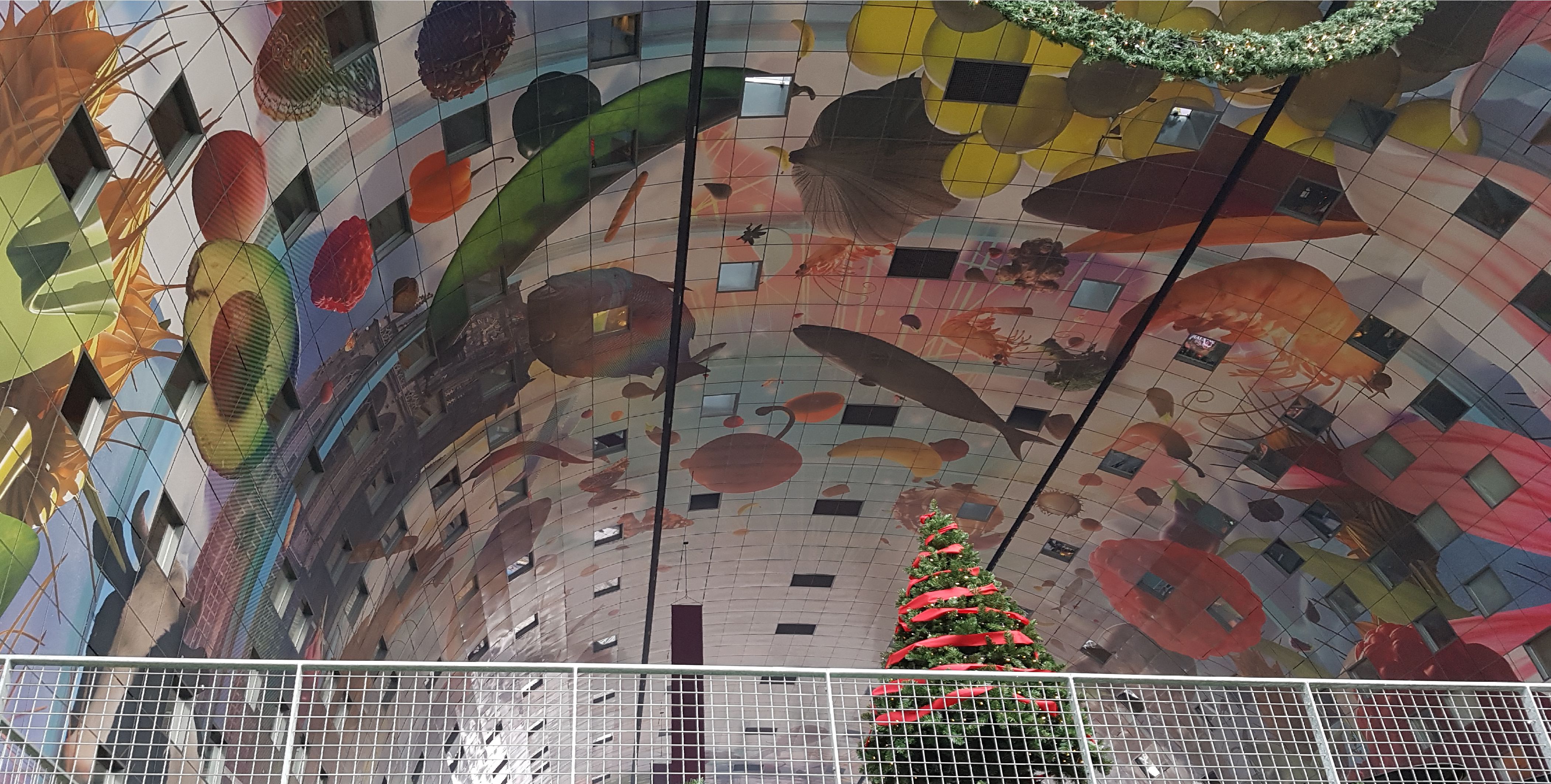 Natürlich geht es auch zur Markthalle, einem der Wahrzeichen Rotterdams – um festzustellen, dass das Marktleben inzwischen wieder auf den Platz und die Straßen vor der Halle ausgewandert ist, ob Fisch, Fleisch, Käse, Obst und Gemüse oder auch Bekleidung und Ramsch. Die Markthalle, in der noch von der hohen gewölbten Decke farbenprächtig und in Großformat all das prangt, was es einmal hier zu kaufen gab, ist inzwischen fast ausschließlich gefüllt mit Fast Food Ständen so ziemlich jeglicher Ausrichtung – die Welt präsent mit all dem, was als standardisiertes Fertigfutter meist aus dem Frost kommend schnell zubereitet und noch schneller gegessen werden kann.