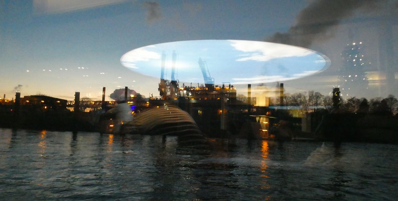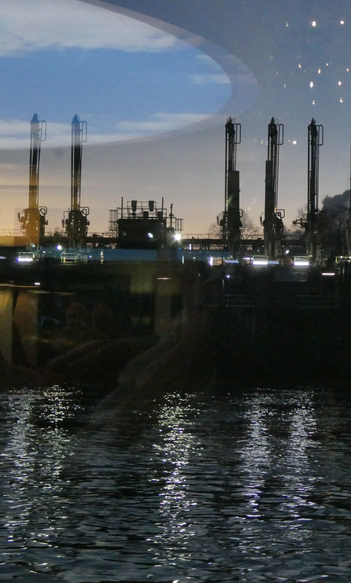 Als es noch dunkler wird, spiegelt sich die Innenbeleuchtung des Schiffes, so dass sich futuristisch anmutende Bilder ergeben.