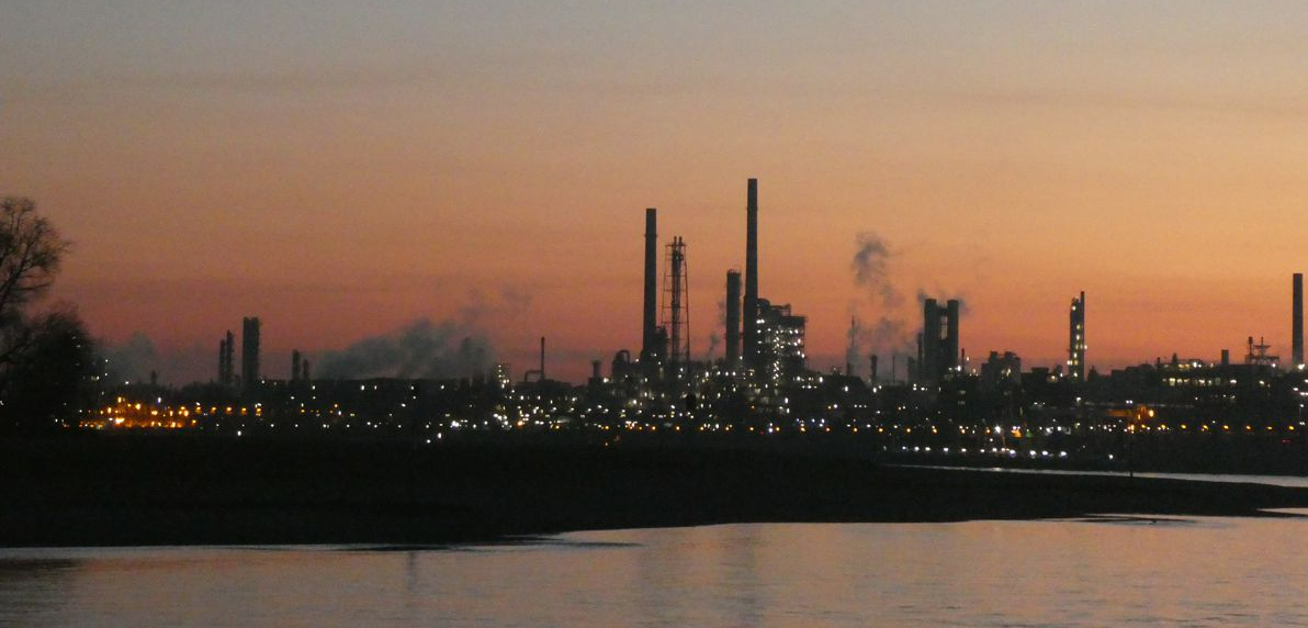 Schon bald sind entlang der Strecke die Vororte von Köln und danach die Industrieanlagen entlang des Flusses in der Abenddämmerung zu sehen.