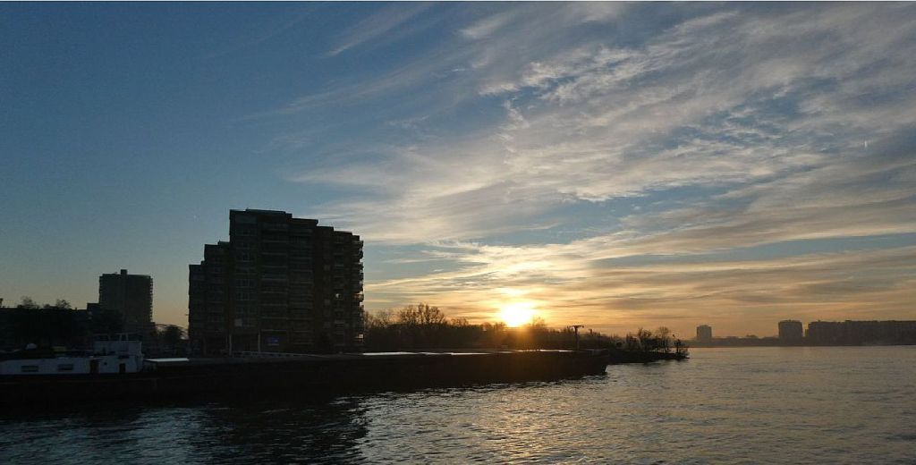 Kurz vor Rotterdam zeigt sich in Richtung Sonnenaufgang eine Morgenstimmung wie aus dem Bilderbuch. Die ersten Häuser der Stadt sind nur schemenhaft und dunkel zu sehen, dafür zeigt der Himmel ein Farbenspiel mit intensiven Blautönen, die Wolken von der Sonne so hinterleuchtet, dass sie von einem Spektrum von vielschichtigsten Orange- und Gelbtönen bis in alle möglichen Grau-Weiß-Färbungen übergehen.