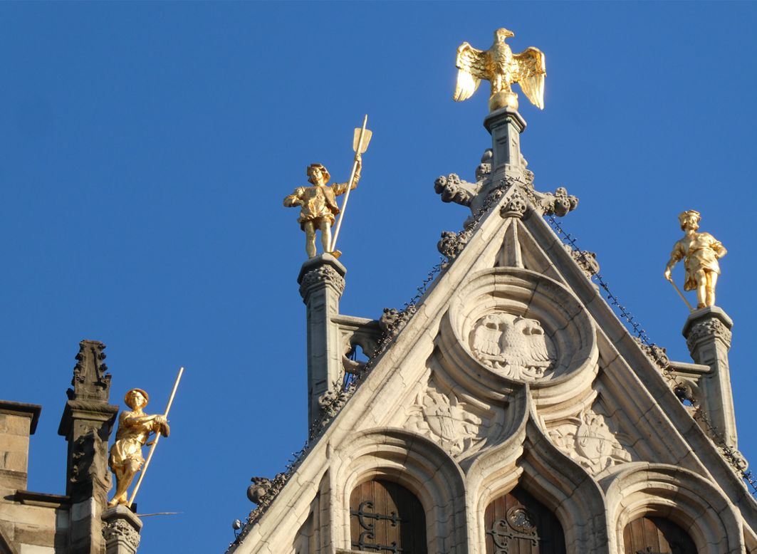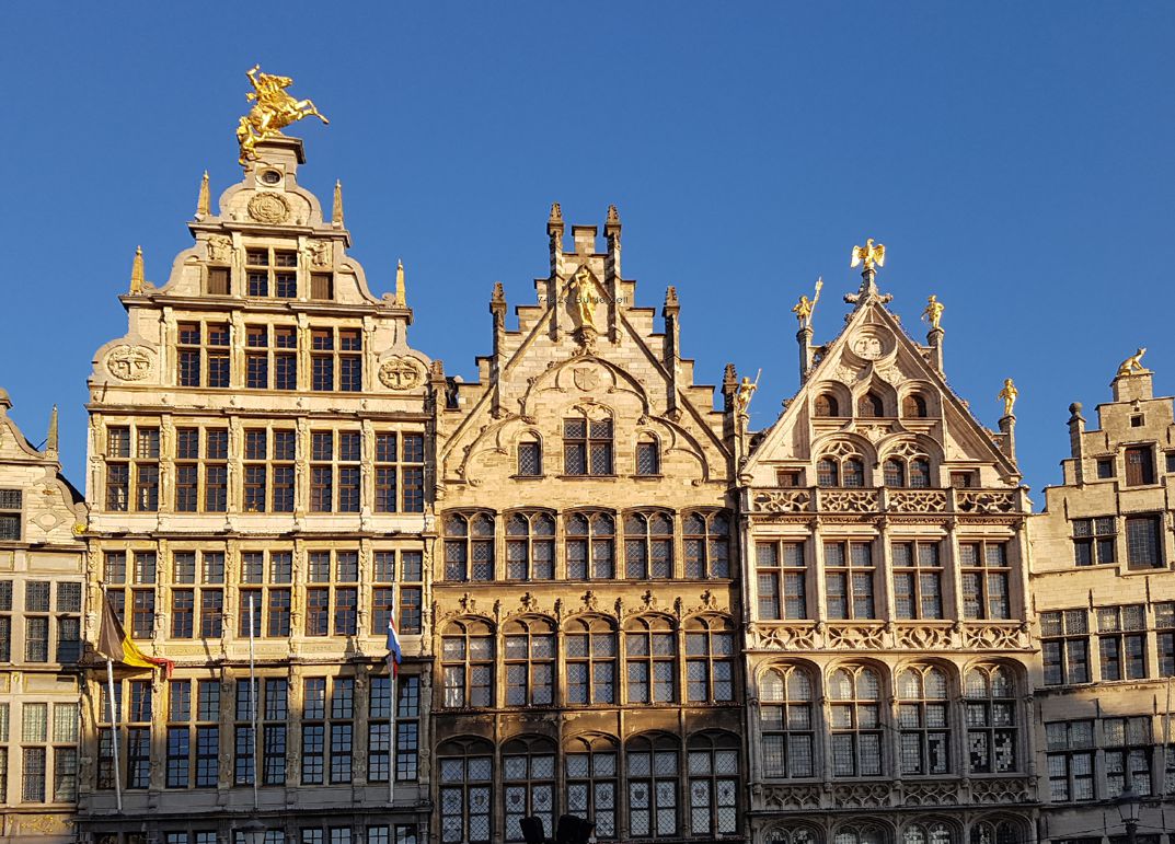 Über den Steg geht es direkt hinein in die Stadt, vorbei an den beeindruckenden hohen, verzierten Backsteinhäusern, die an den Ecken meist mit hellem Stein gefasst sind. Noch haben wir etwas fahles Morgenlicht, aber schon schnell wandelt sich die Farbe des Himmels in ein strahlendes, intensives, fast alles übertönendes Blau – ein krasser Kontrast zu den im Sonnenlicht glänzenden vergoldeten Figuren auf den Zinnen der alten Handelshäuser am Grote Markt.