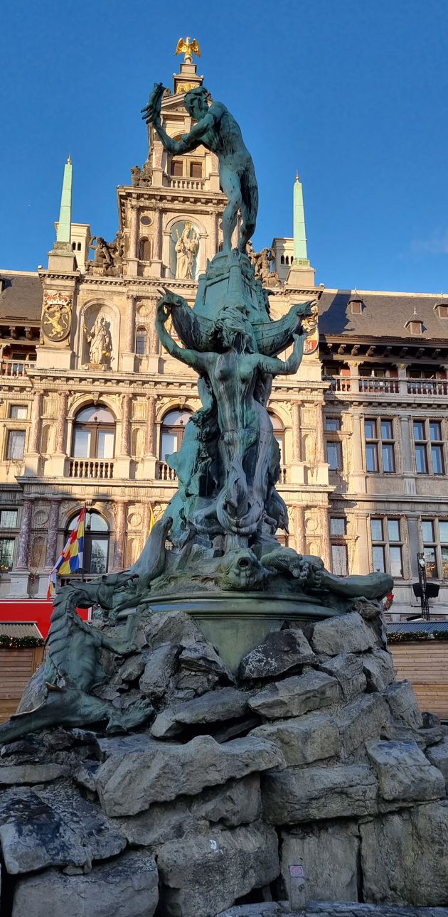 Die Dame auf dem Brabobrunnen, der auf dem Grote Markt, dem von historischen Gebäuden umstandenen Platz im Zentrum Antwerpens steht, präsentiert sich wieder ohne die leichte Bedeckung, die sie bei unserem Aufenthalt vor ein paar Monaten noch trug (siehe früherer Antwerpen-Bericht).