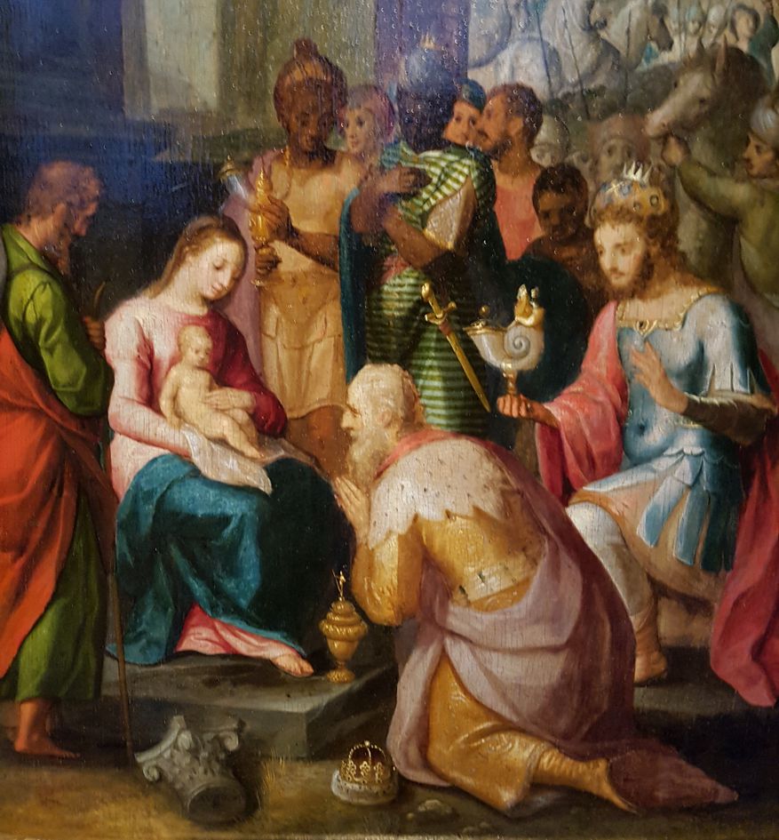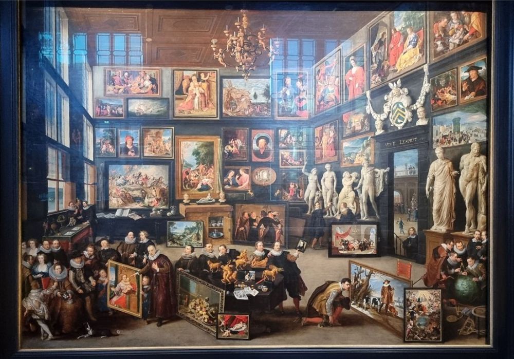 Ausgestellt sind im Rubenshaus auch Werke zeitgenössischer Künstler der Rubenszeit, darunter ein Werk, das vom Motiv her zu den interessantesten Gemälden gehören dürfte. Es trägt den Namen Kunstkammer von Cornelius van der Geest, der Künstler war Willem van Haecht. Im beginnenden 17. Jahrhundert entwickelte sich in Antwerpen ein exklusives Genre, die Kunstkammern, eine Bild-in-Bild-Technik. Auf dem Gemälde wurden im Kleinstformat die Bilder eines Kunstsammlers abgebildet, der so seine Sammlung präsentierte und zugleich ein weiteres Kunstwerk schaffen lies – so wie das Gemälde der Kunstkammer des Cornelius van der Geest, der auch Mäzen von Rubens war. Nebenbei: Leider ließ sich das Bild wegen Spiegelungen in der Fensterfront des Ateliers nicht besser fotografieren.