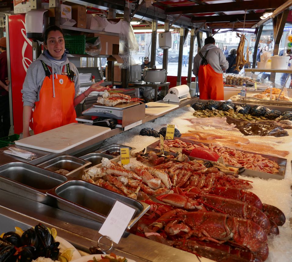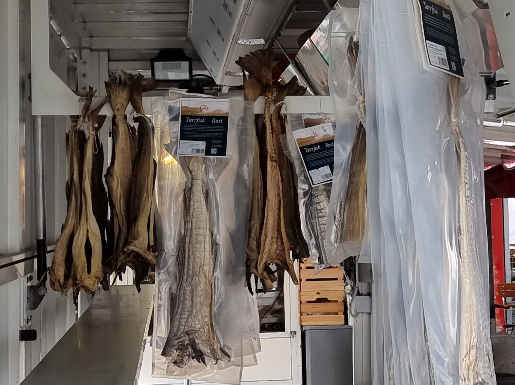 Schnell ist man am Fischmarkt angekommen, inmitten der Stadt. Hier wird gerade noch aufgebaut, auch ein kleiner Markt mit anderen lokalen Anbietern – nicht nur Fisch und allerhand Meeresgetier, sondern auch Schinken und Würste, vor allem Lamm und Rentier, Käse und Milch, Honig, Gemüse.