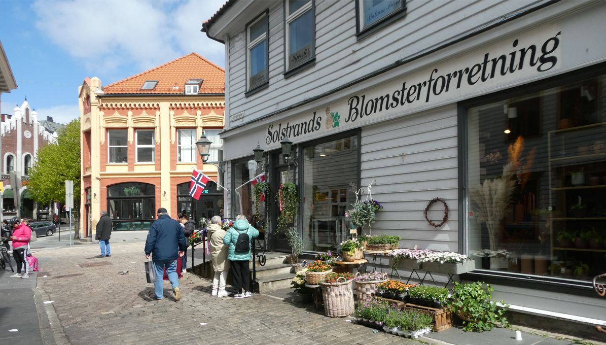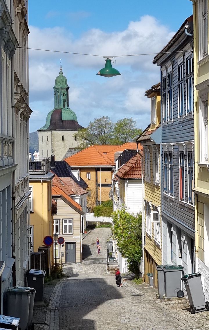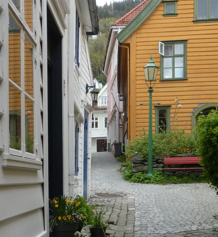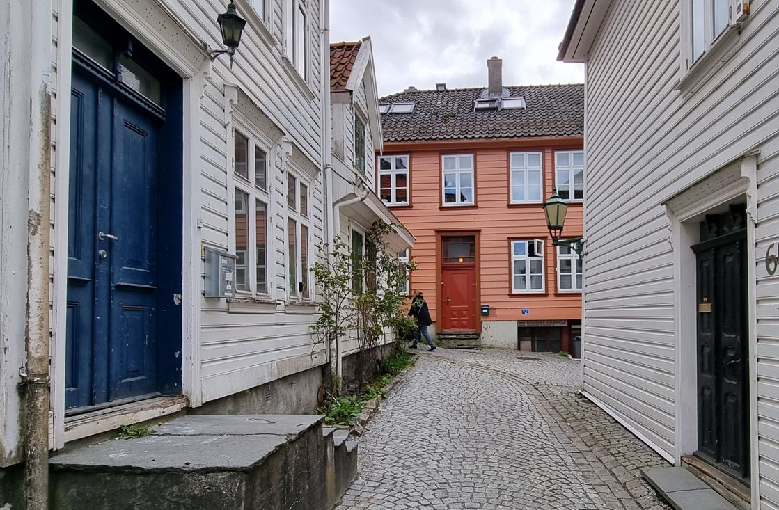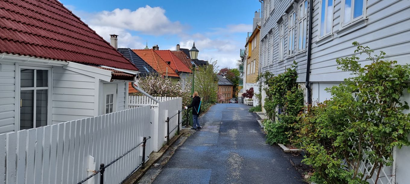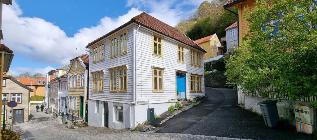Hinaus aus dem Trubel führt uns unser Weg die Hänge hoch, durch enge steile Gassen des alten Wohngebiets von Bergen bis in ziemliche Höhen. Entlang der schmalen Straßen stehen durchwegs die typischen, weiß- oder pastellfarbigen, holzverkleideten Häuser.