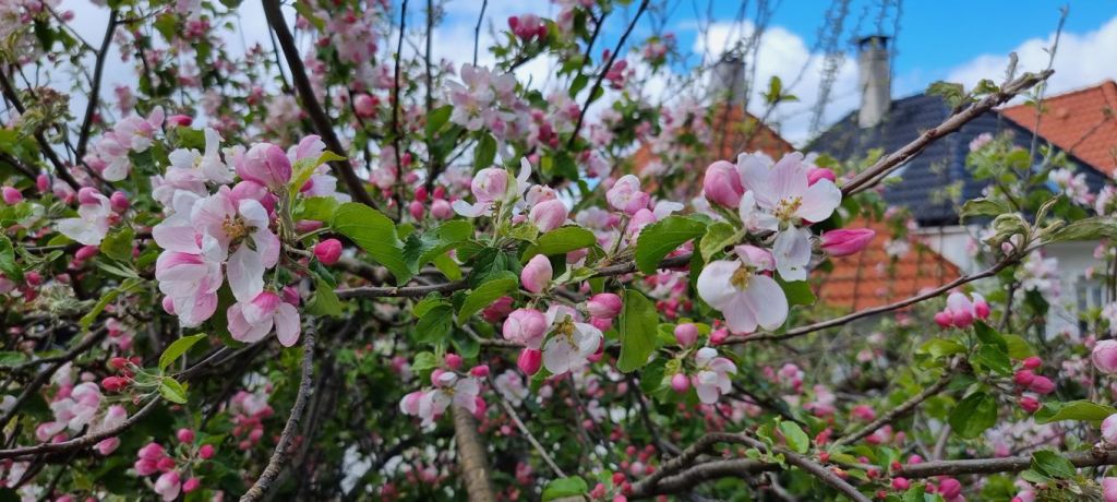 Je höher man den Hang hinauf kommt, desto häufiger sind kleine Gärten zu sehen; an geschützten Stellen stehen bereits die Apfelbäume in voller Blüte.