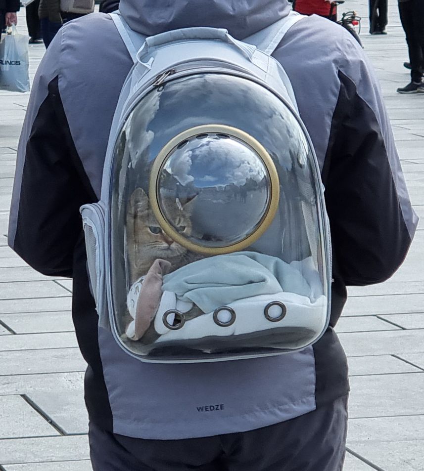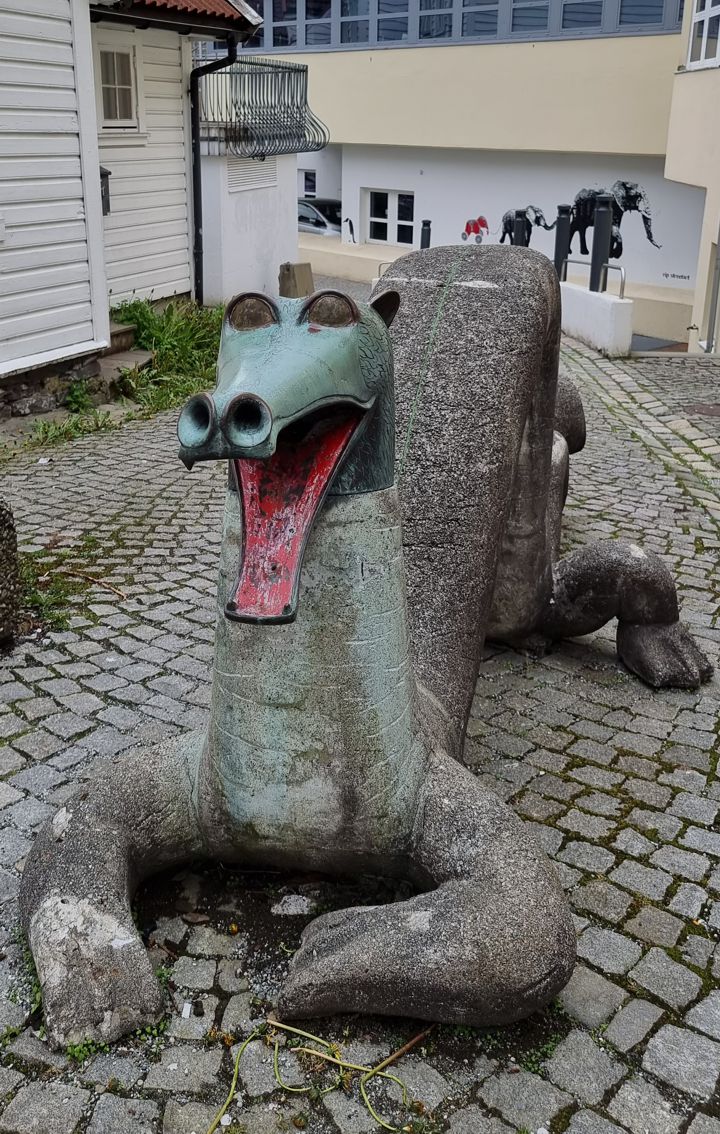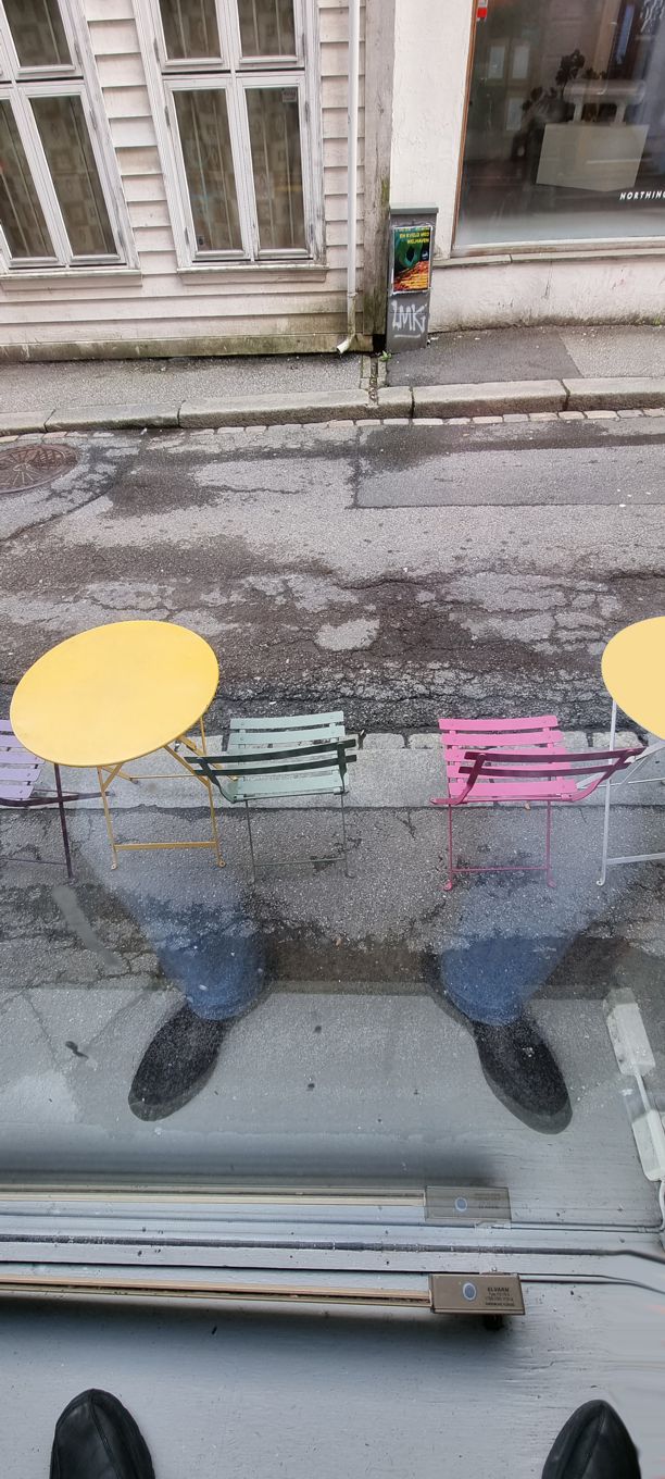 Eher angesagt ist noch ein wenig schlendern durch die Innenstadt, mit so ein paar Entdeckungen, wie eine ziemlich militärisch aussehende Trommlerparade auf dem Festplatz am See, oder der Katzenrucksack, oder der Straßendrache. Ganz unterhaltsam sind die Spiegelungen bei einem kleinen Essen im feinen kleinen Literaturcafè, dem Colonialen Litteraturhuset; zu Mittag gibt’s Fischsuppe und Muscheln.