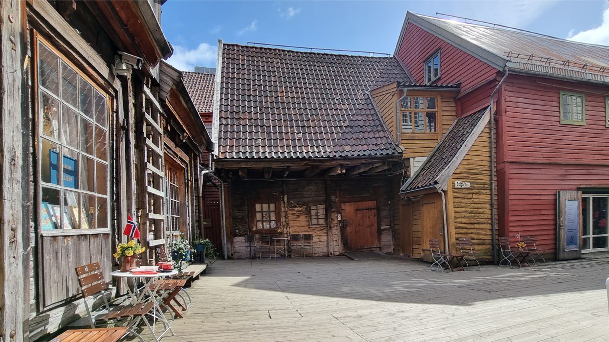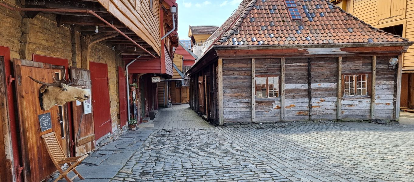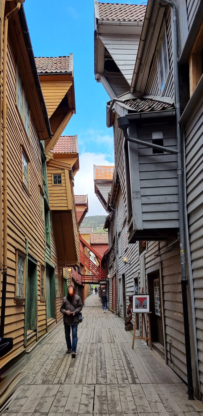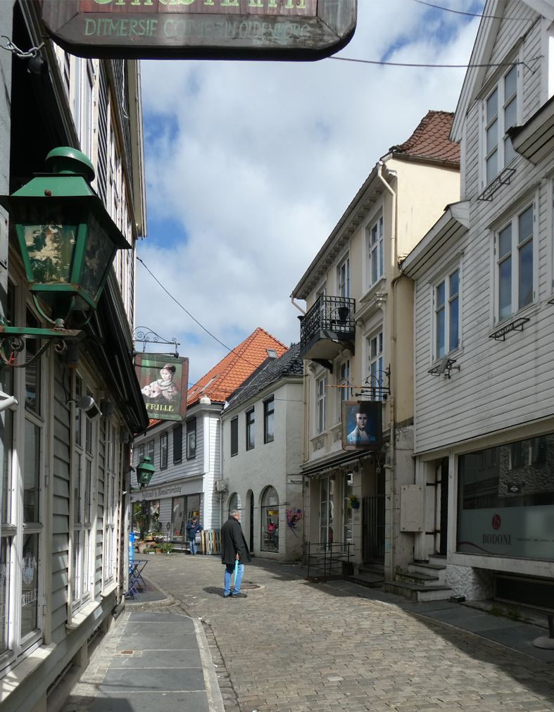 Über das Brygge-Viertel, das so etwas wie die Postkartenansicht von Bergen darstellt, geht’s zurück zum Schiff. Bryggen, das ist das alte Stadtviertel am Hafen, das heute noch so aussieht wie im 12. Jahrhundert, obwohl es Anfang des 18. Jahrhunderts durch einen Großbrand ziemlich zerstört und schon damals im alten Stil wieder aufgebaut wurde. Hier schlendern wir noch ein wenig durch die engen Gassen zwischen den alten, mehretagigen Handelshäusern, genießen noch die Sonnenstrahlen im Außenbereich eines kleinen Cafès, das mittendrin im Viertel liegt.