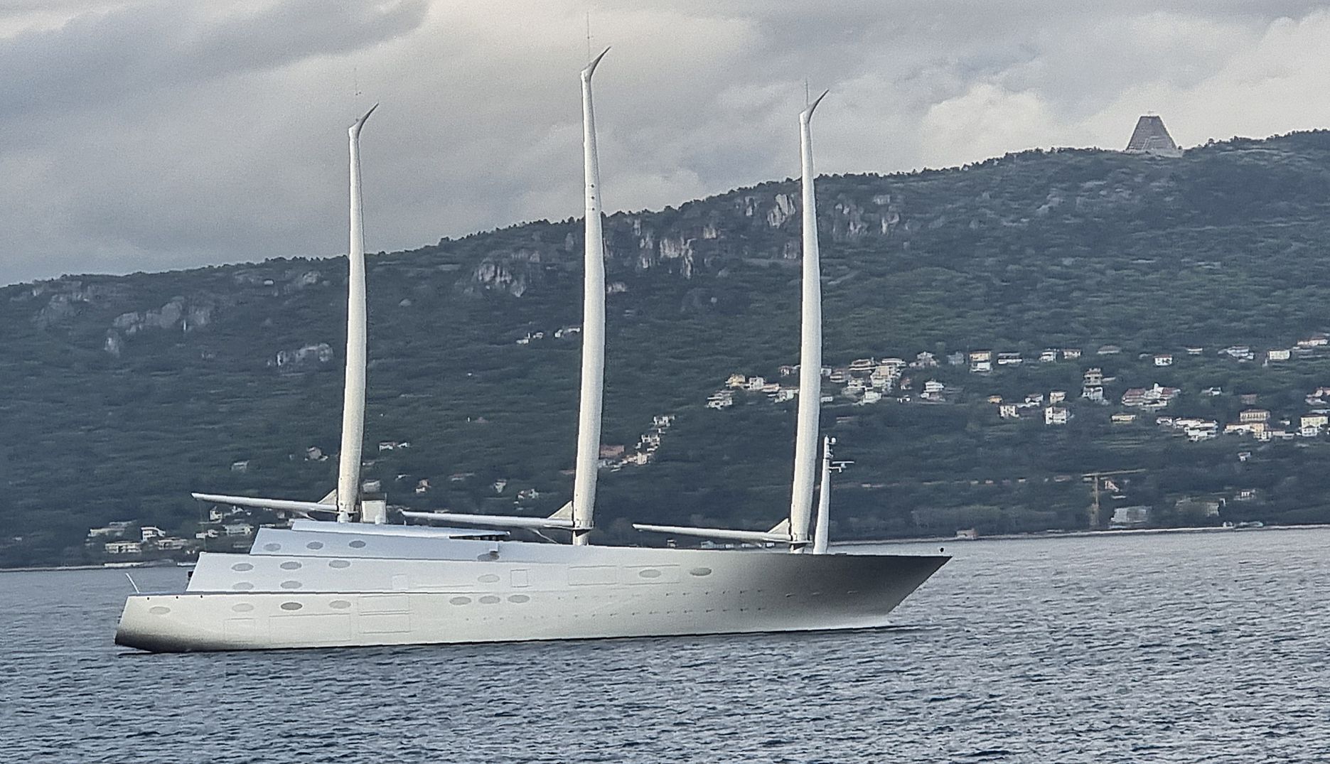 Es ist eine der weltweit größten privaten Yachten, die Al Mirqab, fast so groß wie unser Kreuzfahrtschiff – gemunkelt wird, dass das Schiff dem Emir von Katar gehört, aber etwas genaues ist nicht bekannt, da es anscheinend von einer „Briefkastenfirma“ betrieben wird.