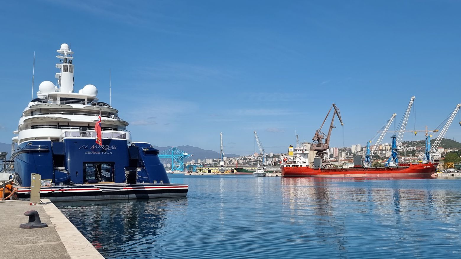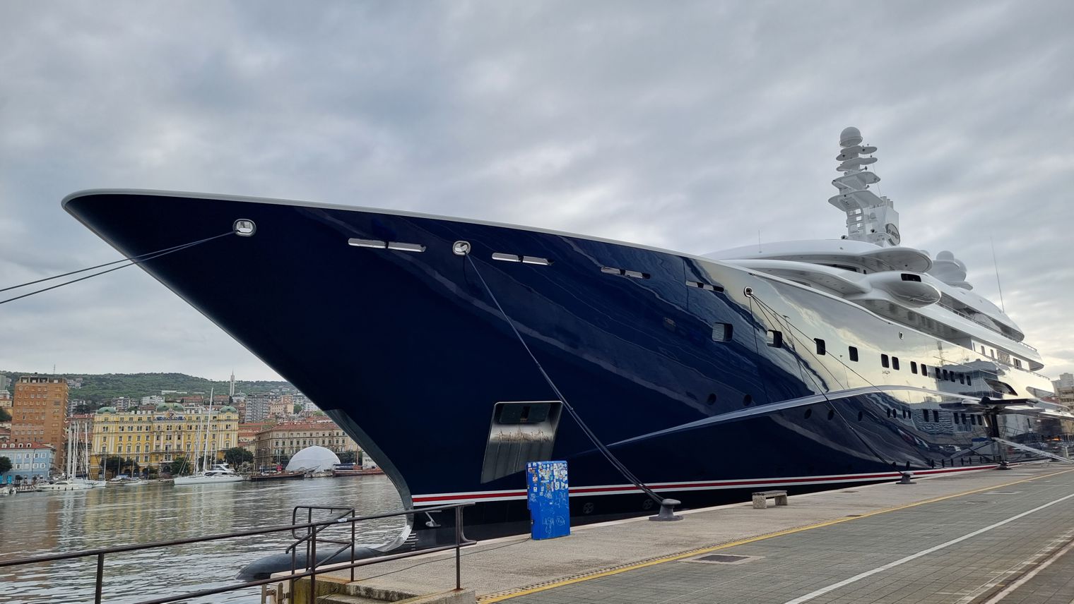 Schon im Hafen von Triest lagen neben den Fischerbooten die edelsten Yachten, bei der Hafenausfahrt begegnete uns ein ganz futuristisches Modell, und im Hafen von Rijeka sind es die edelsten Yachten, die zu sehen sind, aber das sind nur Kleinstmodelle im Vergleich zu der stylischen Edelyacht, die hier an derselben Pier liegt wie wir.