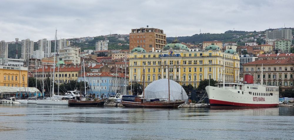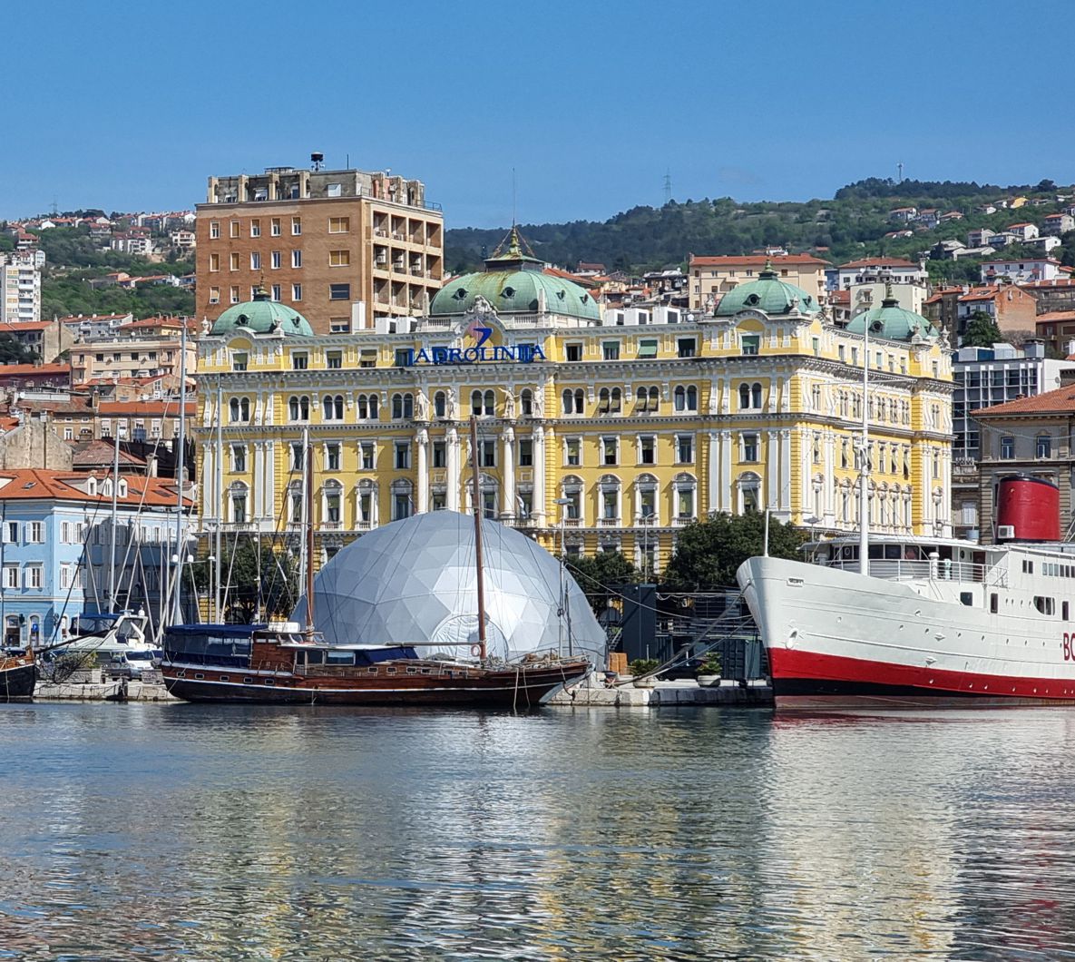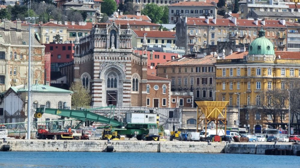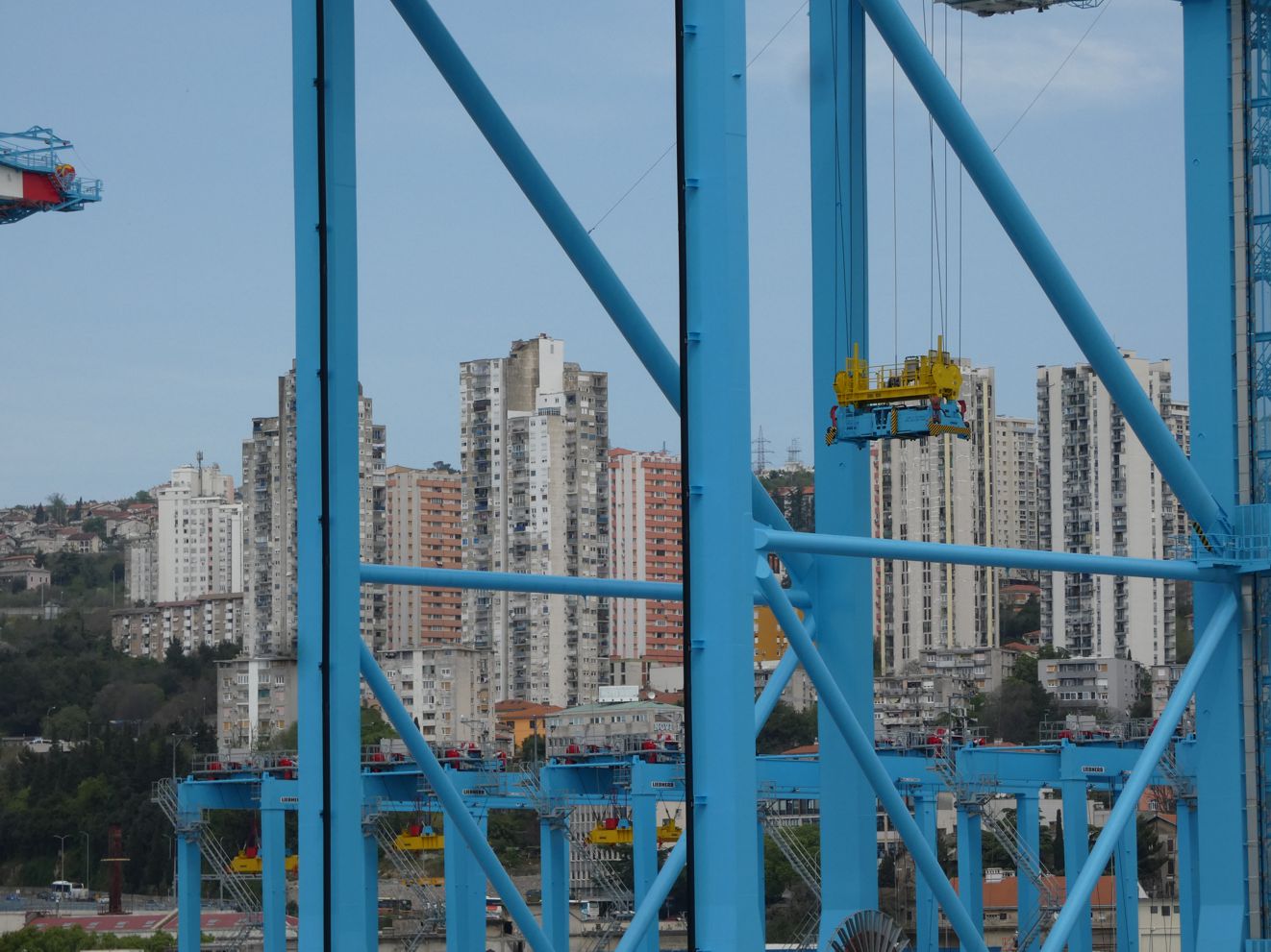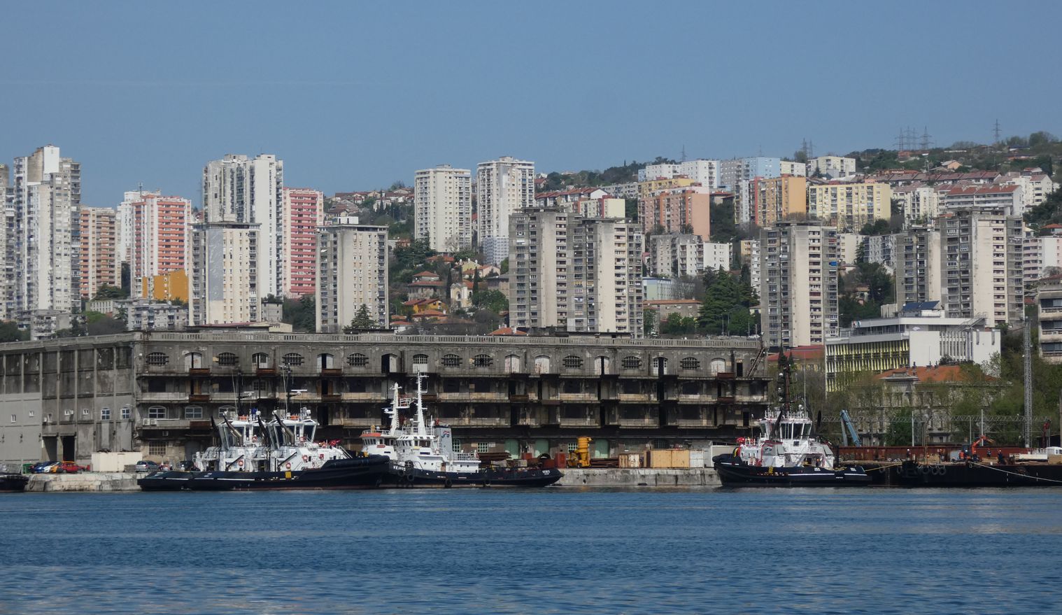 Bei der Ausfahrt aus Rijeka sehen wir vom Schiff aus, dass wir trotz unseres „Markt-Programms“ die alte Innenstadt von Rijeka doch ziemlich durchschritten haben, und die Stadtsilhouette, jetzt nicht mehr wolkenverhangen, vor allem durch eine recht unansehnliche Hochhausbebauung bestimmt wird.