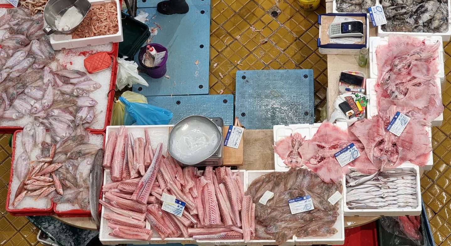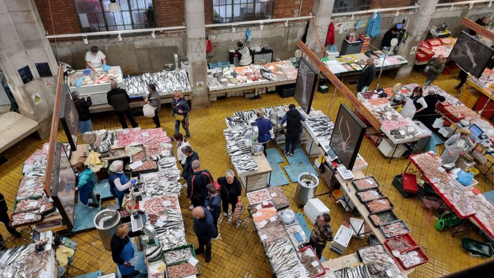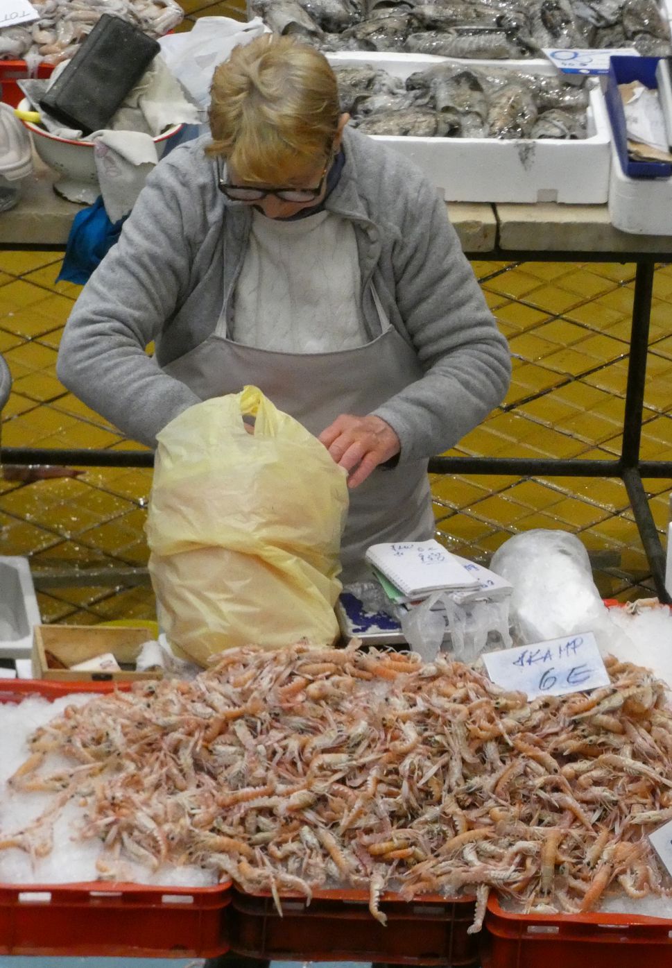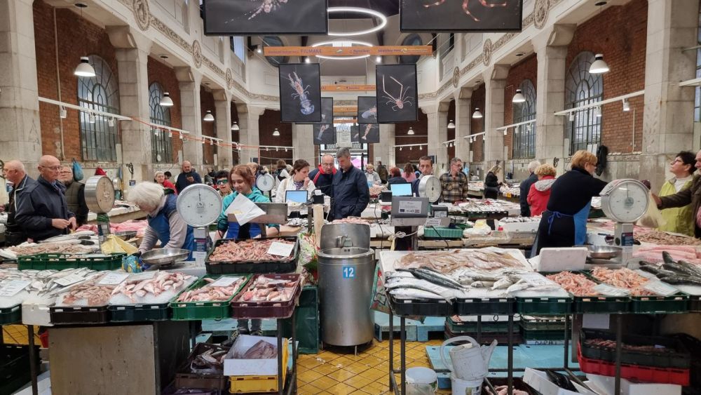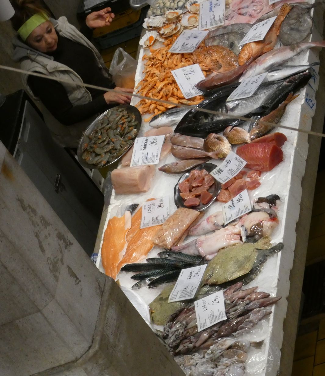 In der alten Markthalle hat man bei einem Rundgang auf der oberen Etage einen hervorragenden Blick auf das Geschehen – wie ausgewählt wird, wer welche Fische oder Krustentiere fertig putzen und herrichten lässt, wie alles in Tüten verschwindet und bezahlt wird.
