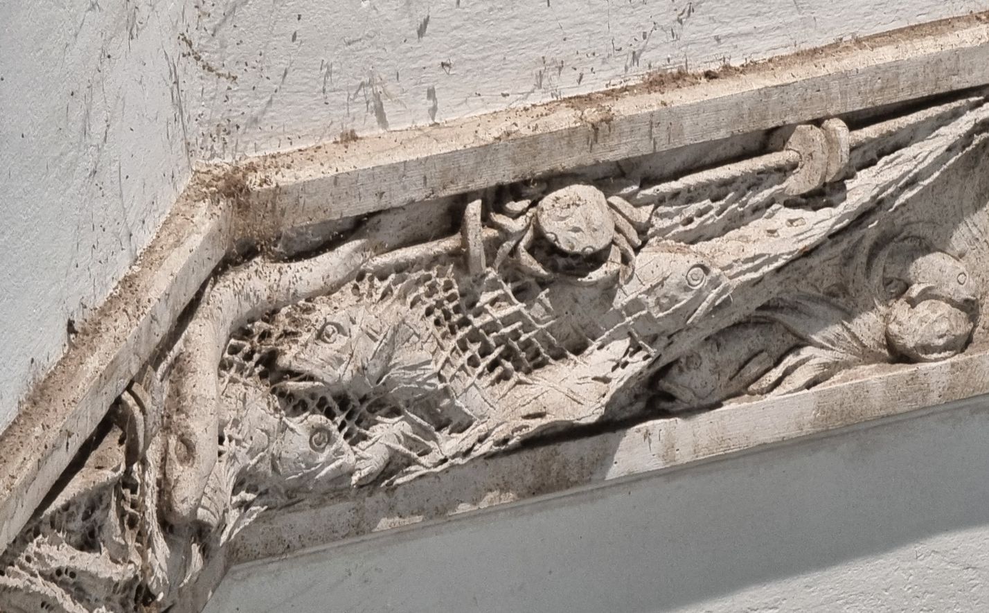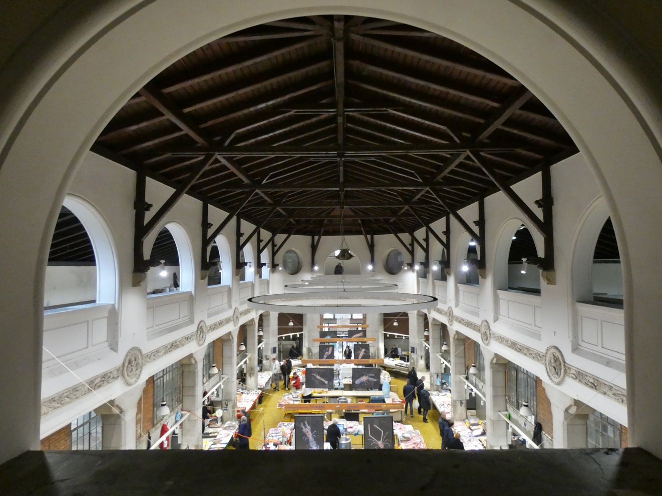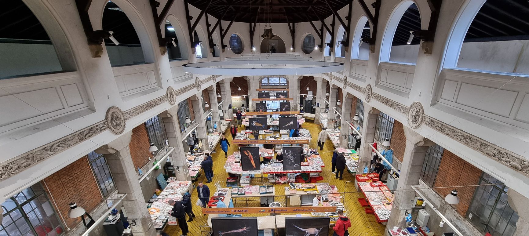Erst auf den zweiten Blick gerät mehr das Bauwerk in den Blick, die Architektur der Halle mit den zwei Ebenen und mit Seitengängen, gebaut fast wie ein Kirchenschiff, verziert mit Säulen und mit Stuckbändern rund um das Thema Fischerei.