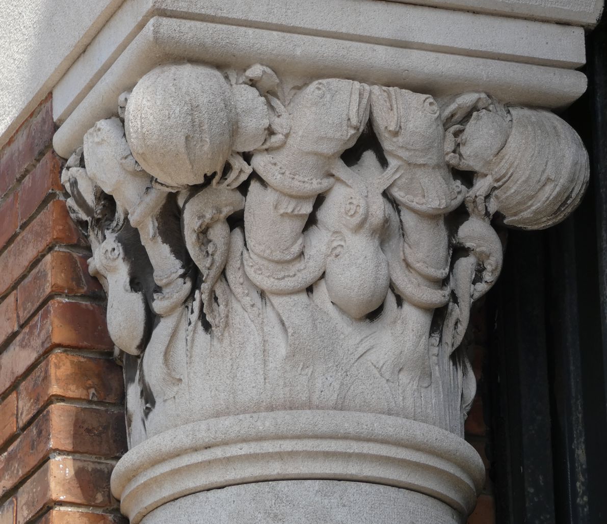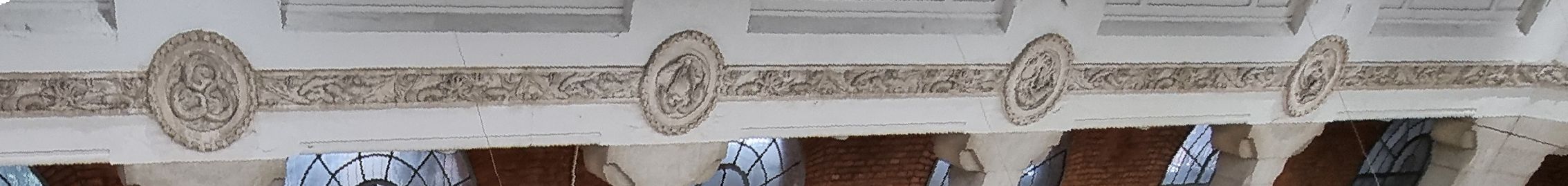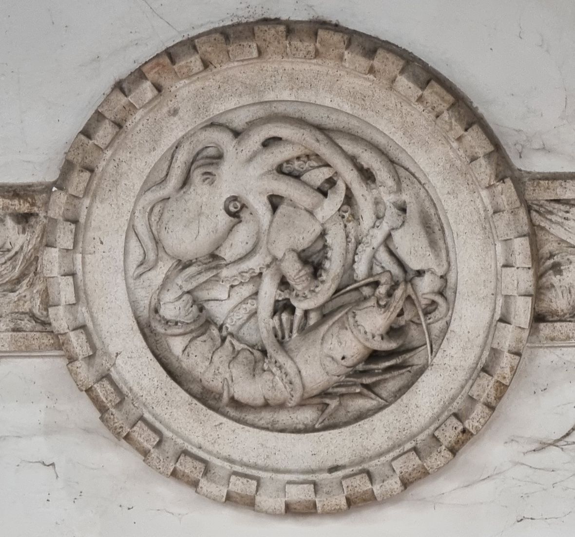 Erst auf den zweiten Blick gerät mehr das Bauwerk in den Blick, die Architektur der Halle mit den zwei Ebenen und mit Seitengängen, gebaut fast wie ein Kirchenschiff, verziert mit Säulen und mit Stuckbändern rund um das Thema Fischerei.