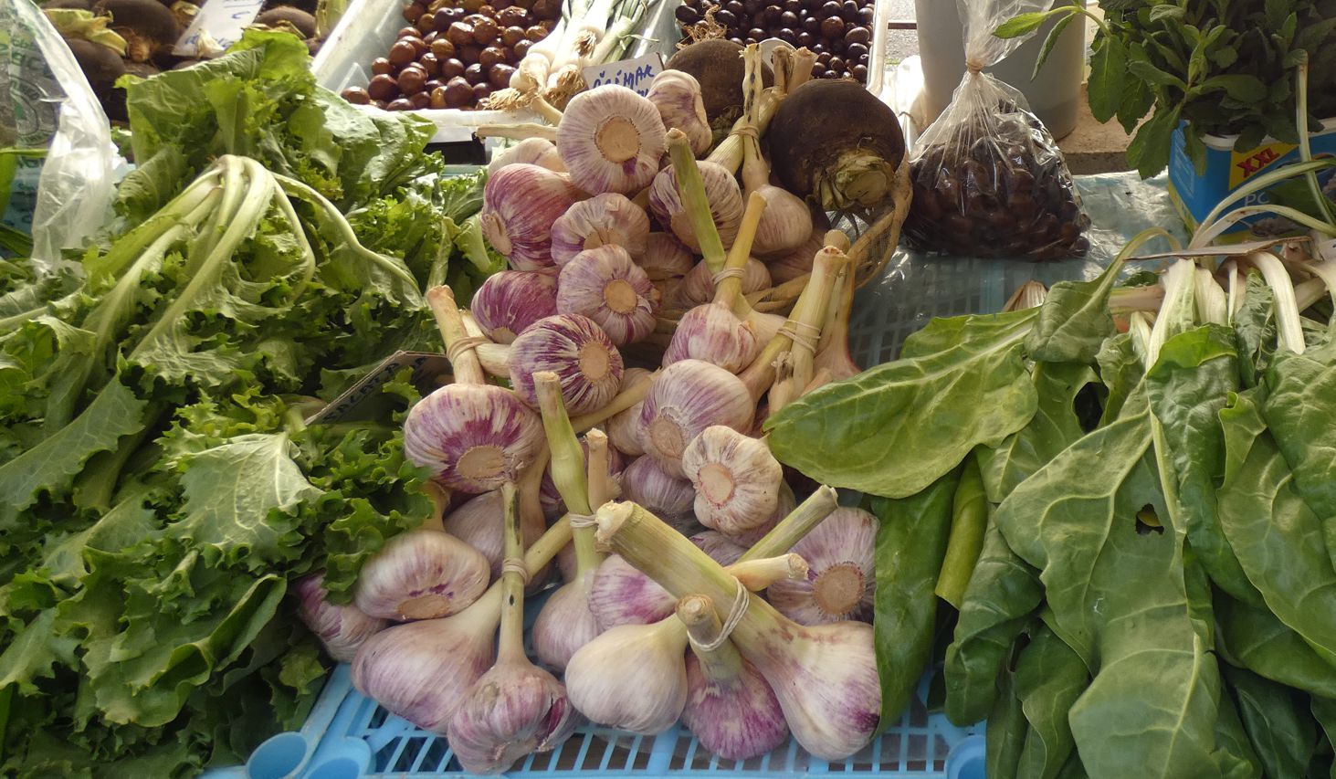 Dicke Wassergurken und dünne Schlangengurken. Spinat, Mangold, Möhrchen, rote und gelbe Beete, alle möglichen großen und kleinen und bunten Rübchen, Radieschen, Knoblauch, Variationen von Frühlingszwiebeln, und so weiter. Zitronen sind auch fast überall zu sehen, die gibt es ja eigentlich immer; Orangen sind seltener. Die ersten Erdbeeren sind da. An einigen Ständen gibt es getrocknete Feigen oder auch Walnüsse und Haselnüsse.