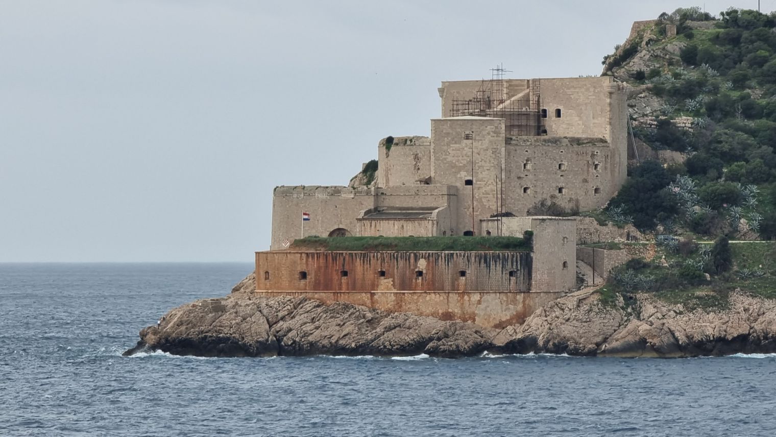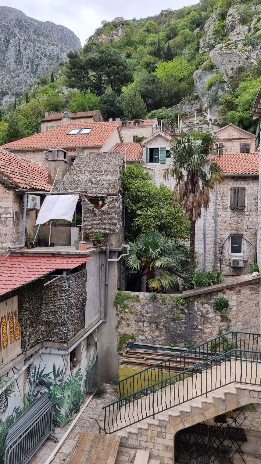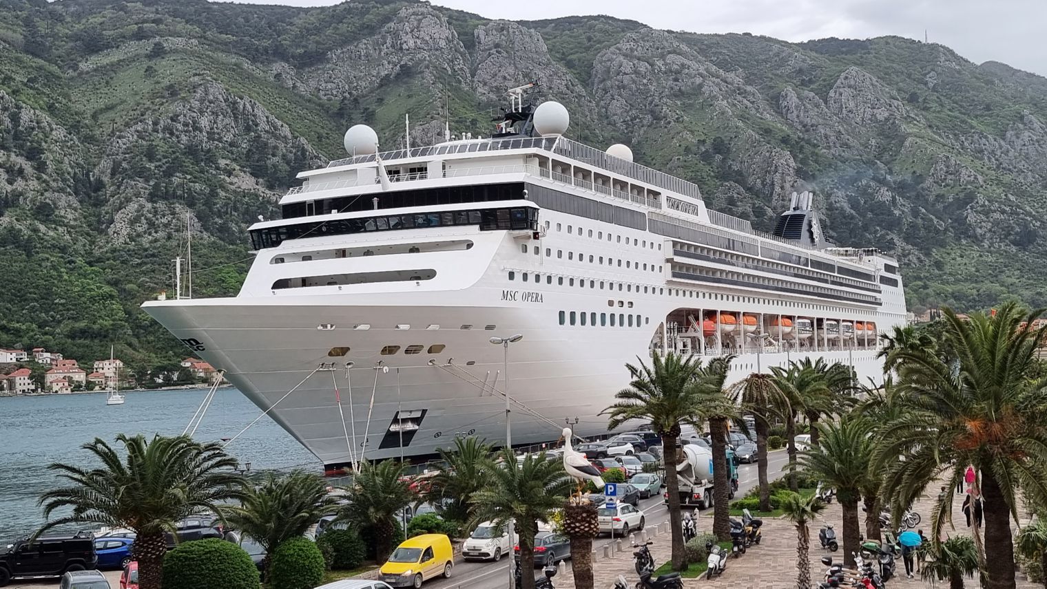 Angeschmiegt an den Hang, umgeben von Mauern, die schon von der Ferne sichtbar sind, die sich entlang des Ufers um die Stadt herum und weit auf die Anhöhen hinaufziehen, liegt schließlich Kotor im letzten Winkel des Fjords, massiv, bei wolkenverhangenem Himmel fast düster, wie eine mittelalterliche Festungsanlage. Der Schiffsanleger ist belegt von einem anderen Kreuzfahrtschiff, das von See aus weit mehr auffällt als die Stadt selbst, obwohl es zu den kleineren Schiffen zählt.