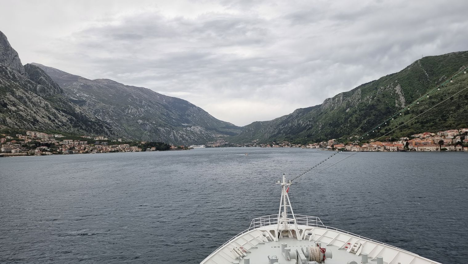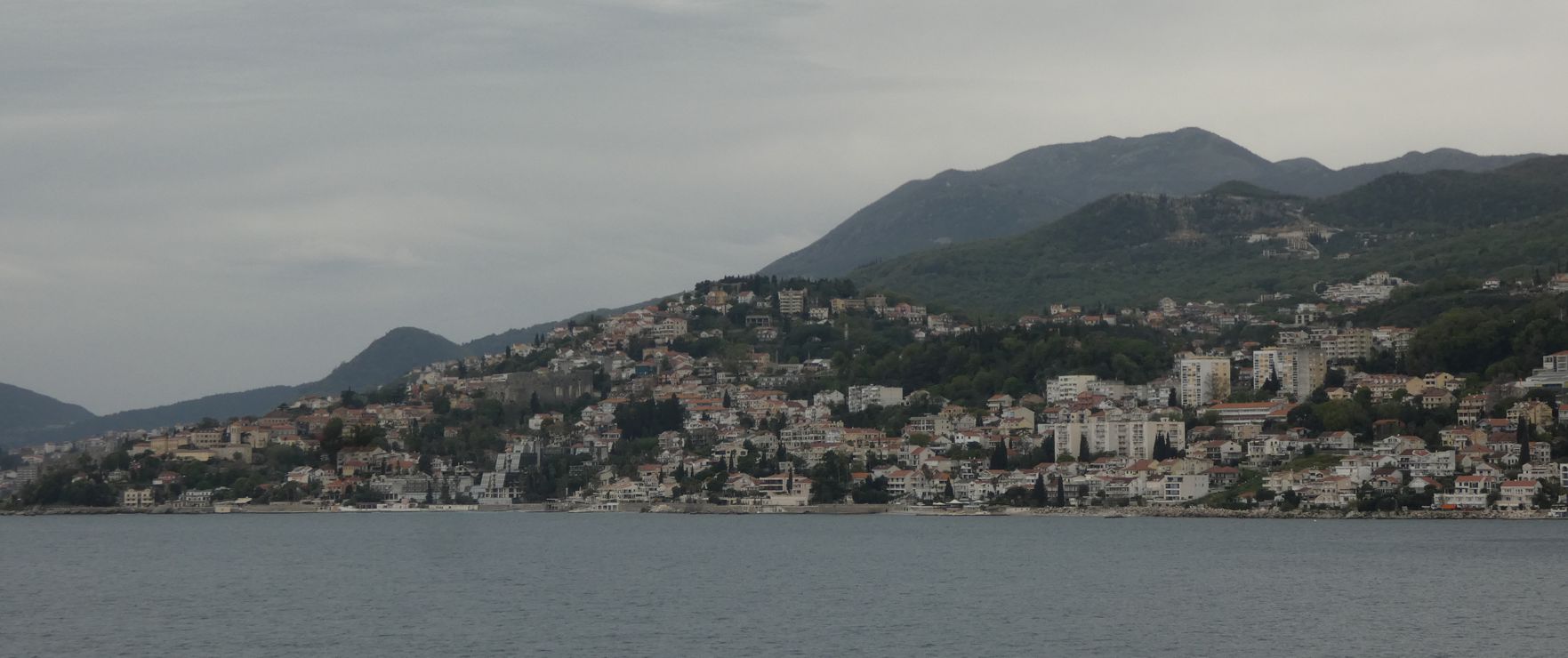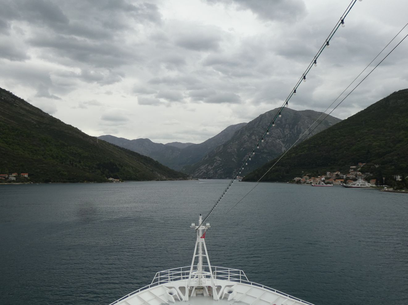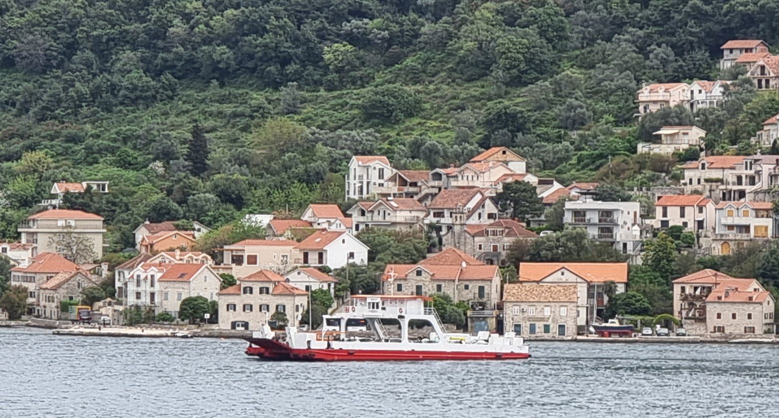 Je weiter es auf Kotor zugeht, desto kontrastreicher werden die Ufer. Vielfach sind es noch dichte Wälder, die zu sehen sind, mit vereinzelten Gehöften oder Städtchen. Aber in bevorzugten Lagen zeigt sich eine immer dichter werdende Bebauung an den Ufern, auch mit großen Hotelanlagen. Wir erinnern uns an unsere Fahrt in die Bucht hinein vor etwa 15 Jahren – da dominierte hier noch die Natur, weniger die dichte Bebauung mit immer höheren Gebäuden.