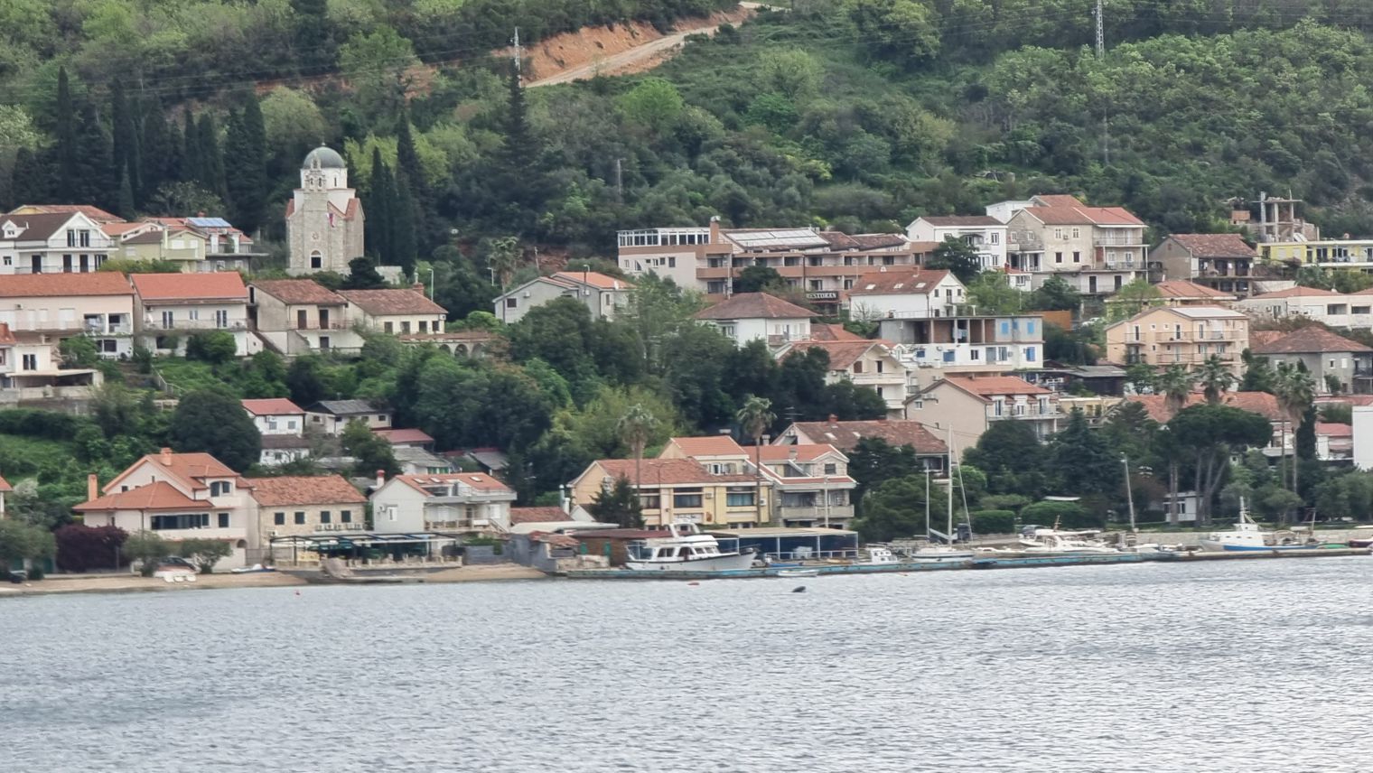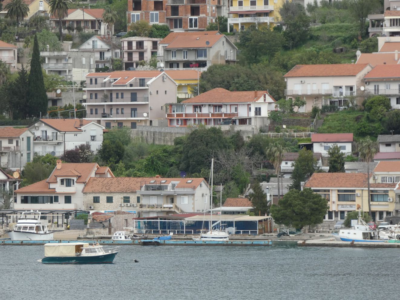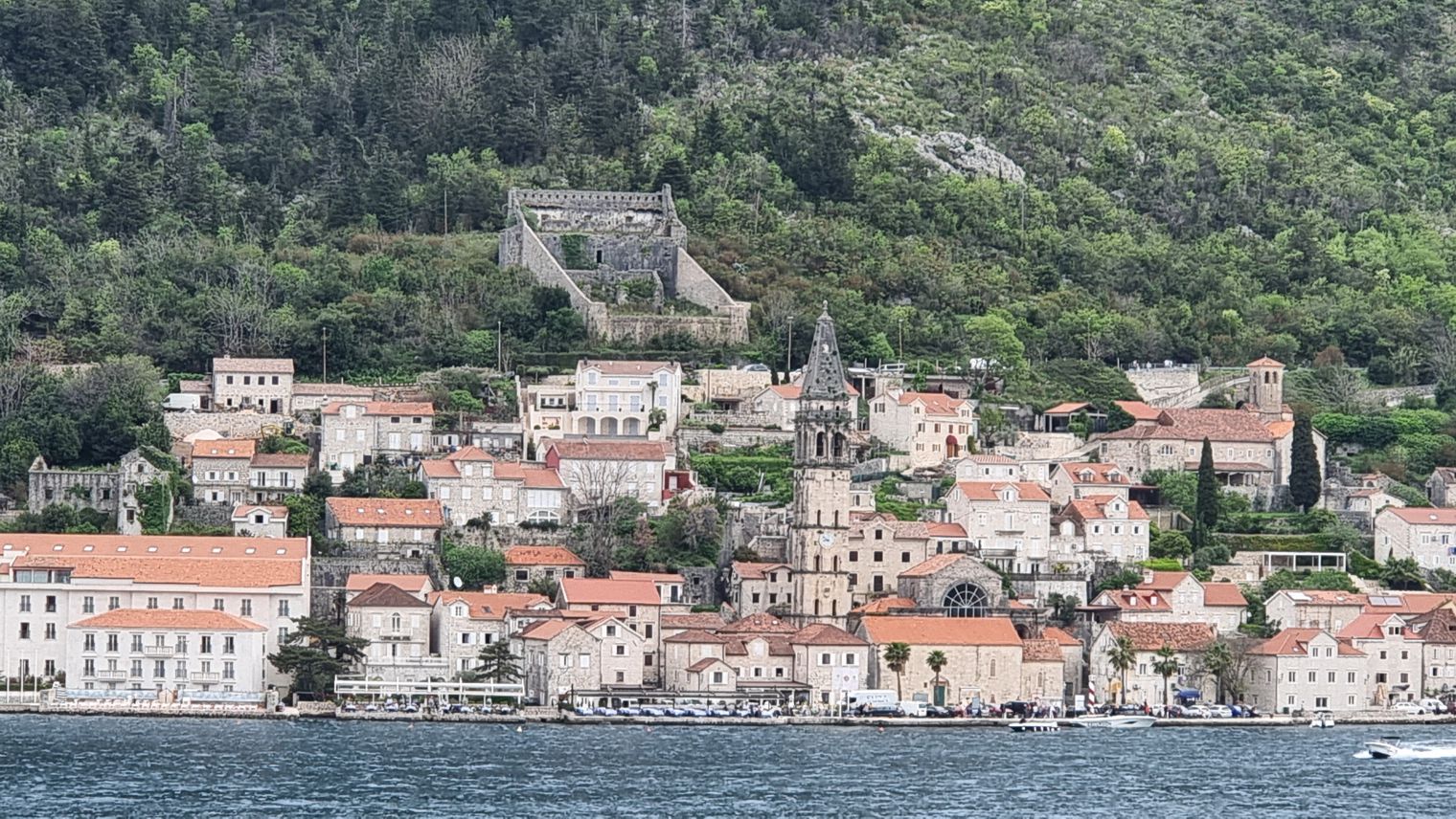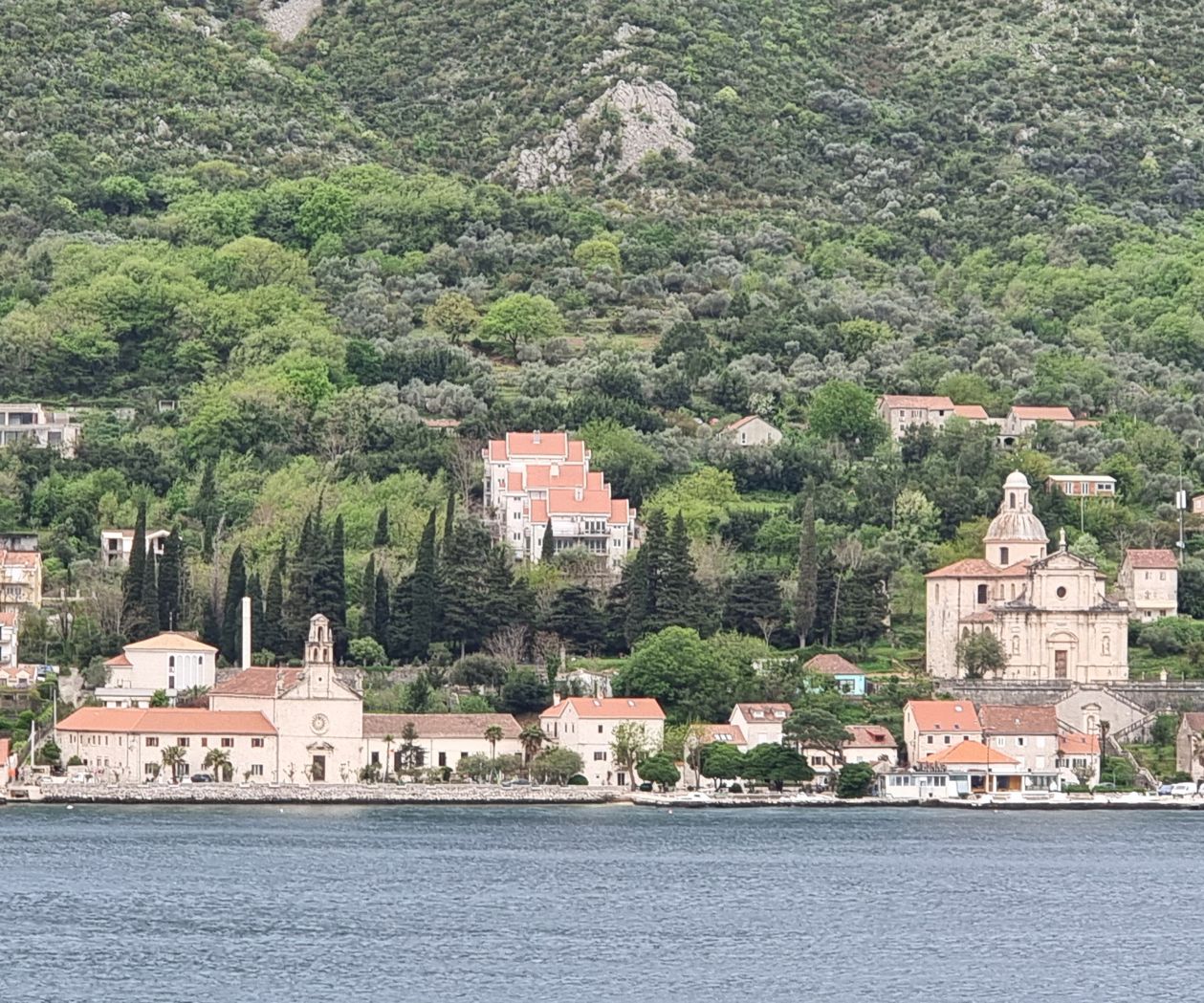 Je weiter es auf Kotor zugeht, desto kontrastreicher werden die Ufer. Vielfach sind es noch dichte Wälder, die zu sehen sind, mit vereinzelten Gehöften oder Städtchen. Aber in bevorzugten Lagen zeigt sich eine immer dichter werdende Bebauung an den Ufern, auch mit großen Hotelanlagen. Wir erinnern uns an unsere Fahrt in die Bucht hinein vor etwa 15 Jahren – da dominierte hier noch die Natur, weniger die dichte Bebauung mit immer höheren Gebäuden.