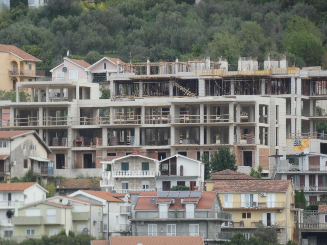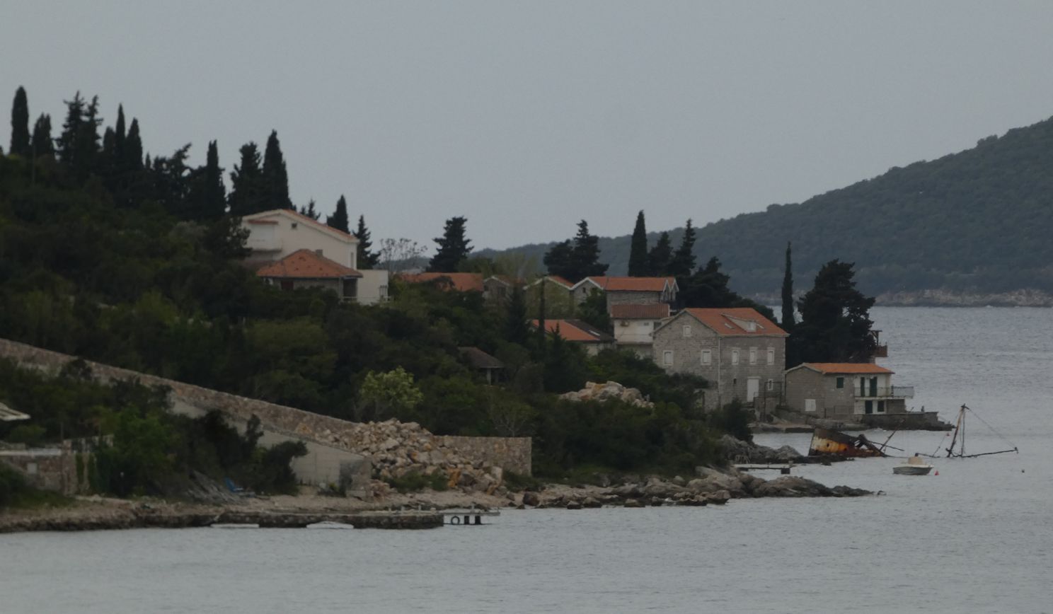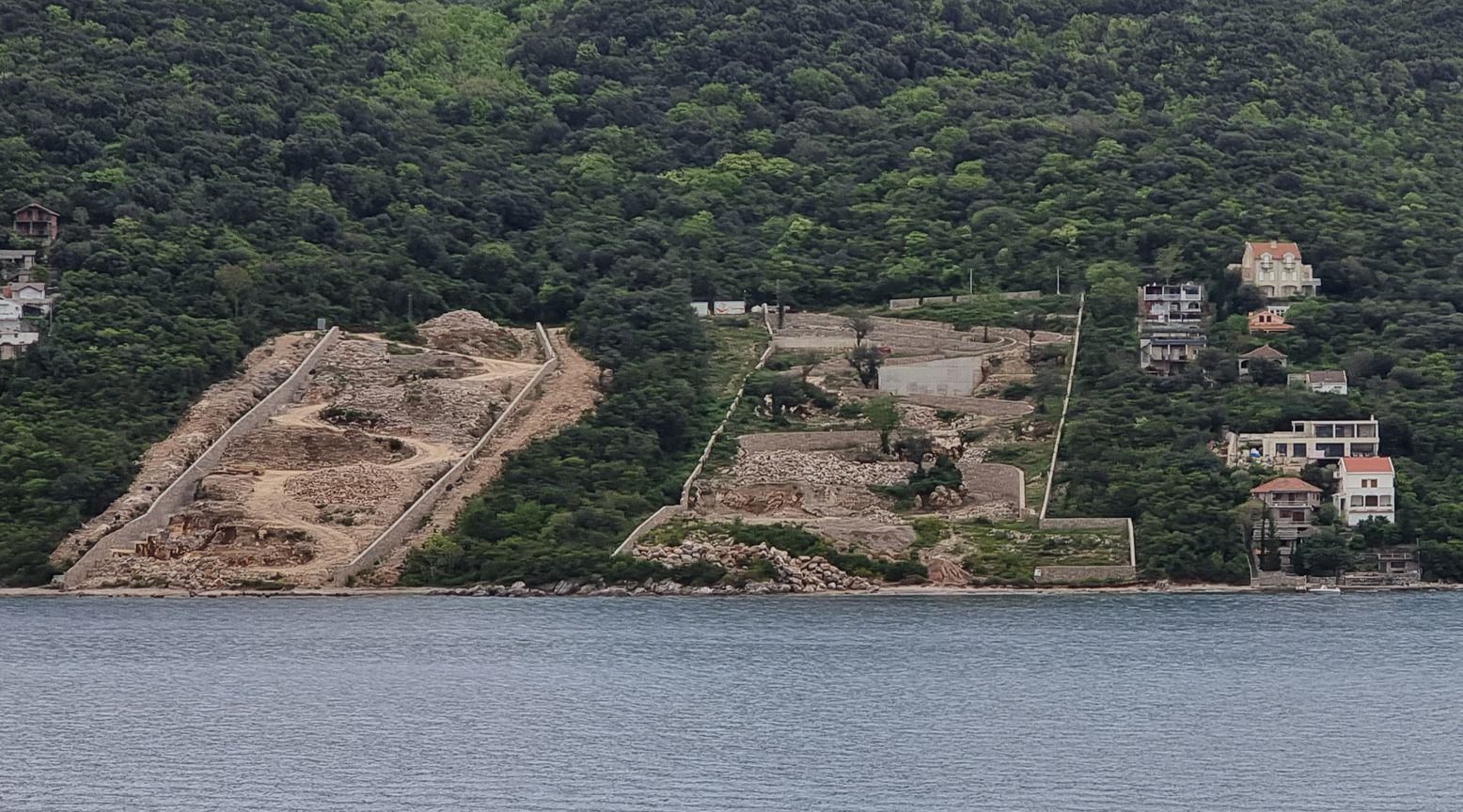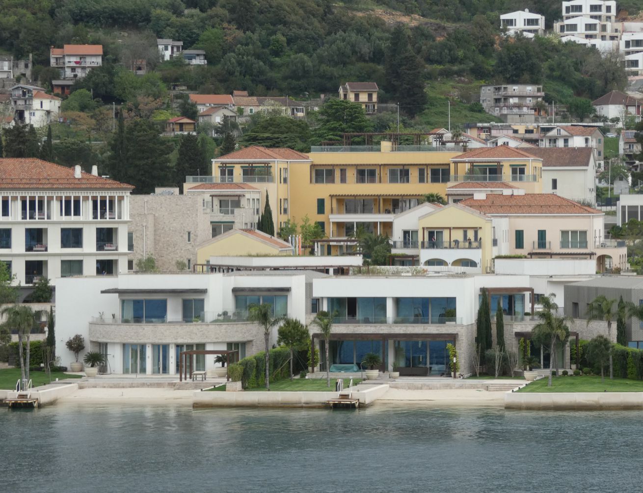 Je weiter es auf Kotor zugeht, desto kontrastreicher werden die Ufer. Vielfach sind es noch dichte Wälder, die zu sehen sind, mit vereinzelten Gehöften oder Städtchen. Aber in bevorzugten Lagen zeigt sich eine immer dichter werdende Bebauung an den Ufern, auch mit großen Hotelanlagen. Wir erinnern uns an unsere Fahrt in die Bucht hinein vor etwa 15 Jahren – da dominierte hier noch die Natur, weniger die dichte Bebauung mit immer höheren Gebäuden.