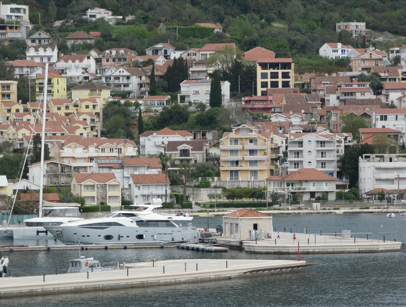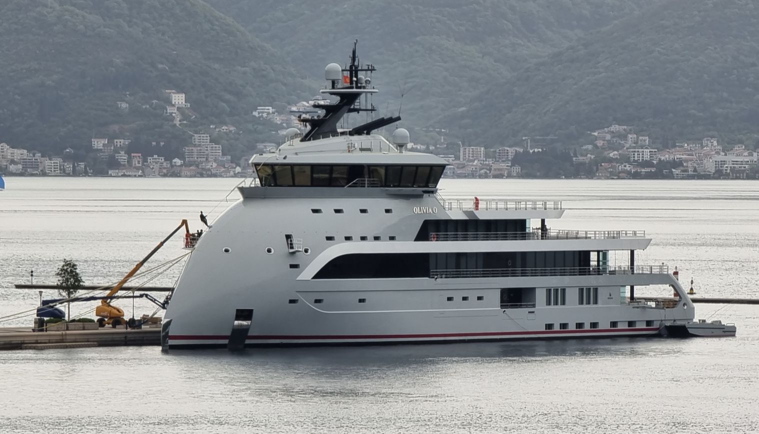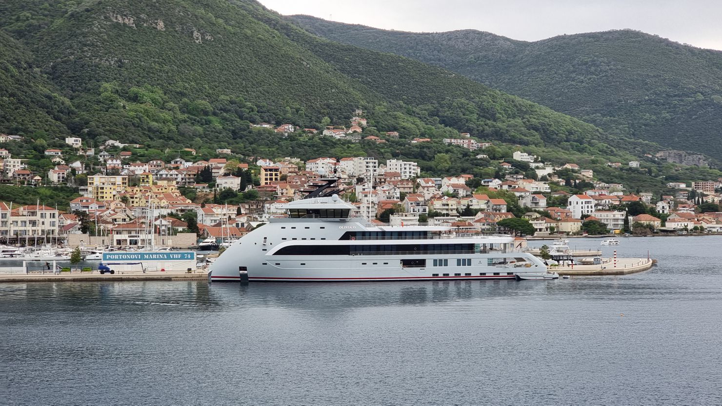 Bei einer Ansammlung von Ferienanlagen mit dem Hafen namens Portonovi liegen dann nicht einfach Yachten und Segler, mehr oder weniger luxuriös, sondern auch ein ungewöhnlich aussehendes Schiff – erste Vermutung, es sei ein Forschungsschiff. Aber eine kurze Recherche im Internet liefert die Info, dass es „nur“ die ziemlich futuristische Luxusyacht „Olivia 0“ des israelisch-britischen Milliardärs Ofer ist, die angeblich einen Wert von 200 Mio. Dollar haben soll.