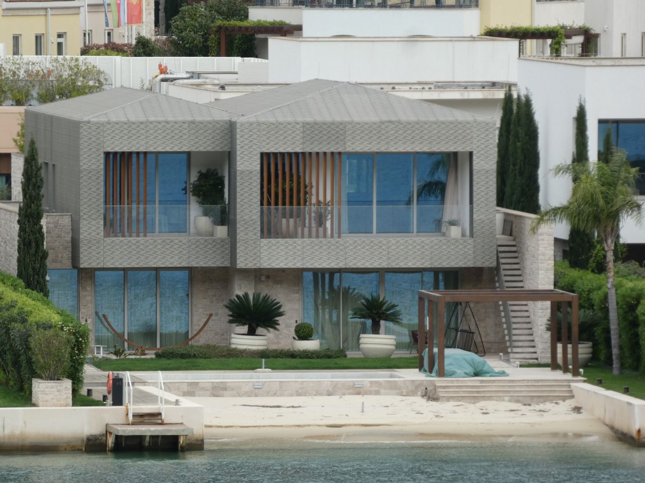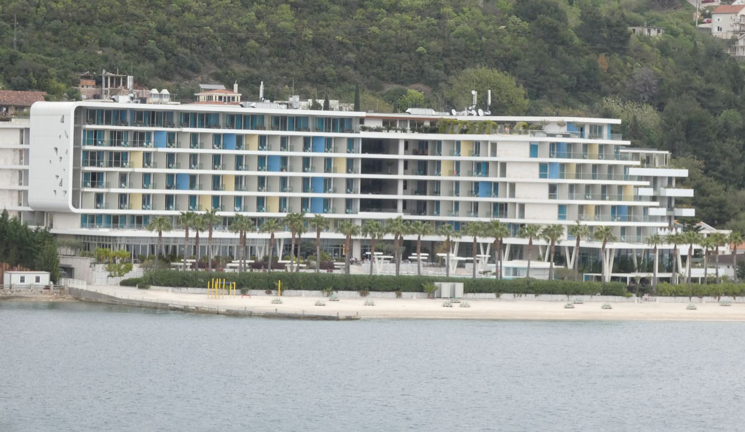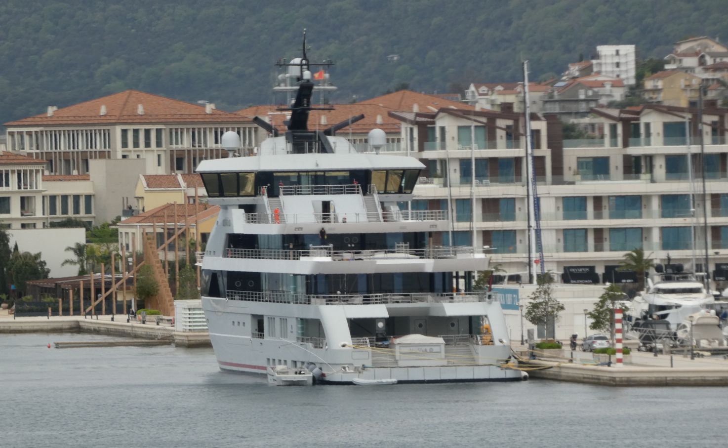 Bei einer Ansammlung von Ferienanlagen mit dem Hafen namens Portonovi liegen dann nicht einfach Yachten und Segler, mehr oder weniger luxuriös, sondern auch ein ungewöhnlich aussehendes Schiff – erste Vermutung, es sei ein Forschungsschiff. Aber eine kurze Recherche im Internet liefert die Info, dass es „nur“ die ziemlich futuristische Luxusyacht „Olivia 0“ des israelisch-britischen Milliardärs Ofer ist, die angeblich einen Wert von 200 Mio. Dollar haben soll.