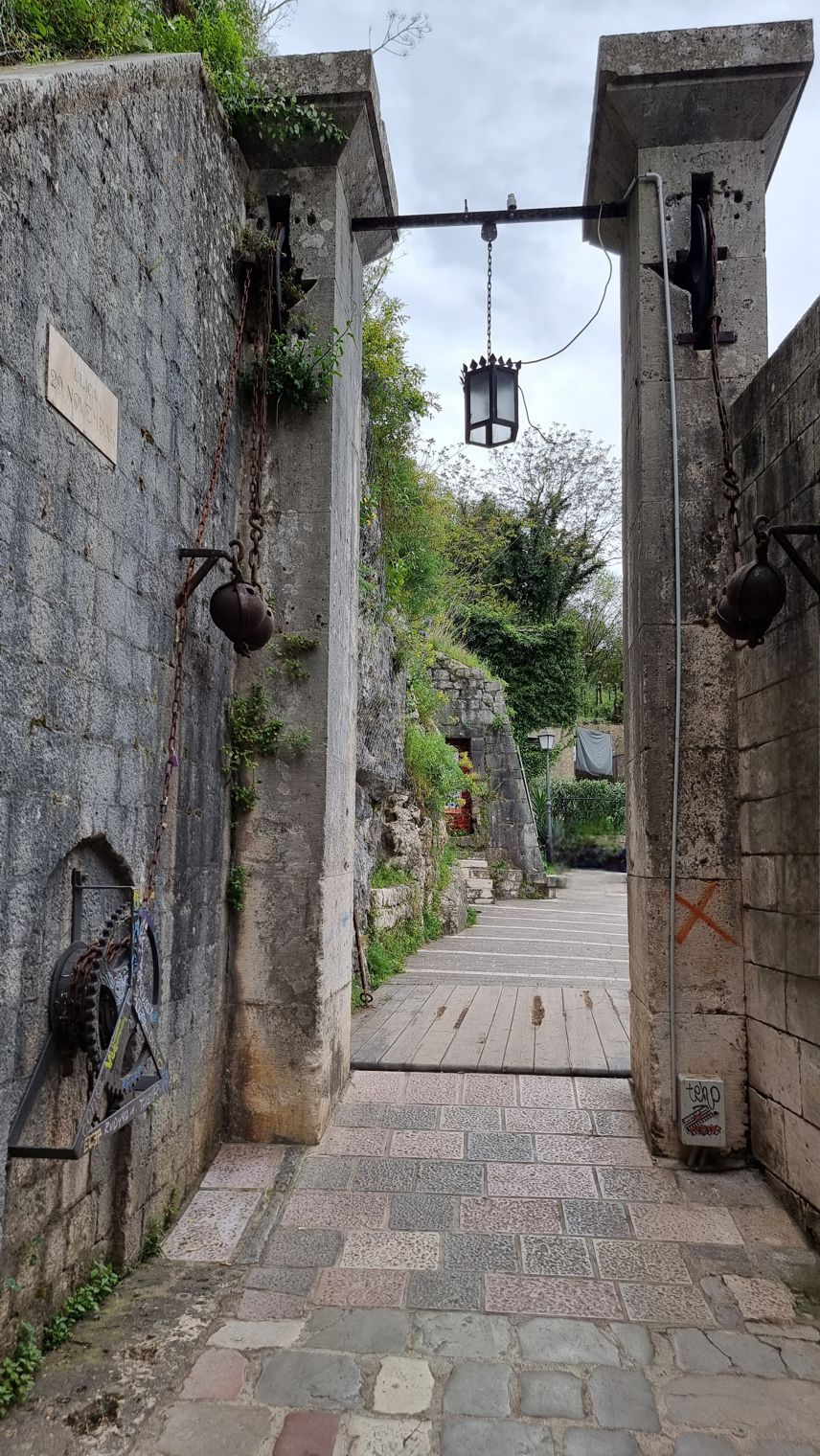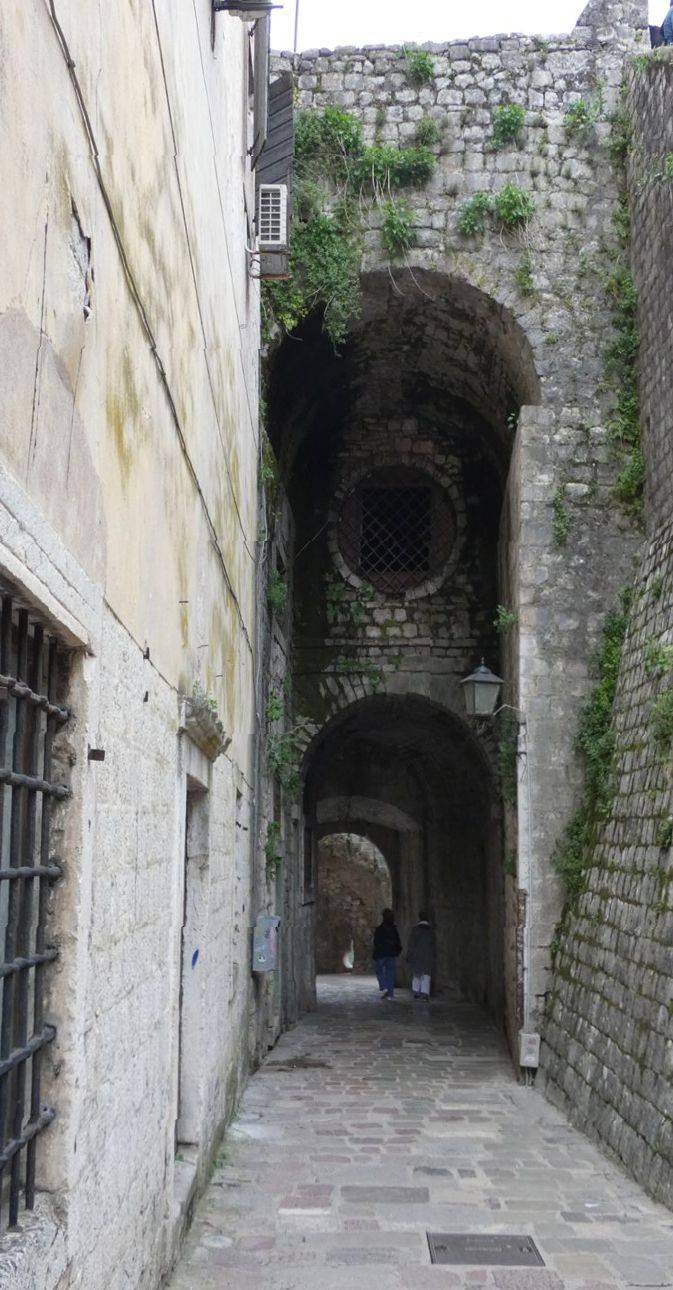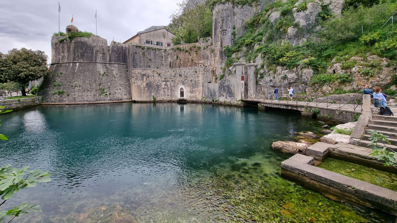 Wir gehen die Stadtmauer entlang, kommen erst dort, wo der Anstieg auf den hinter der Stadt liegenden Berg beginnt, durch das westliche Tor in die Stadt hinein. An der Stadtmauer, direkt beim Tor, geht es vorbei an einem tiefblauen Teich mit sehr klarem Wasser; an der Seite liegt ein kleines Becken, in das anscheinend fortwährend frisches Wasser nachläuft. Eine kurze Recherche ergibt, dass es eine Quelle ist, die aus dem Karstgebirge gespeist wird, und dass diese Quelle in venezianischer Zeit in das Verteidigungssystem der Stadt integriert war – Kotor gehörte ja fast vier Jahrhunderte lang zur Republik Venedig.