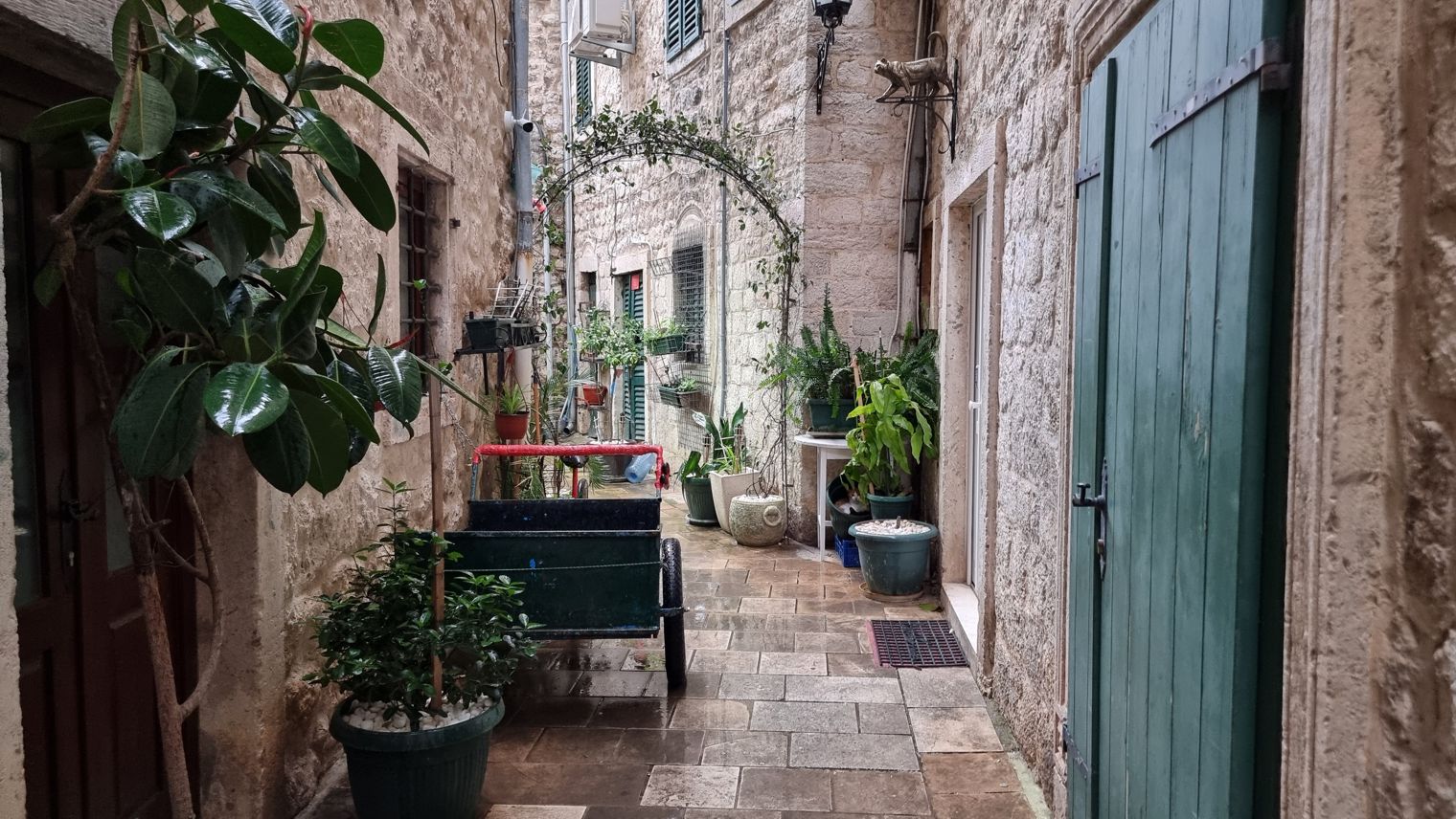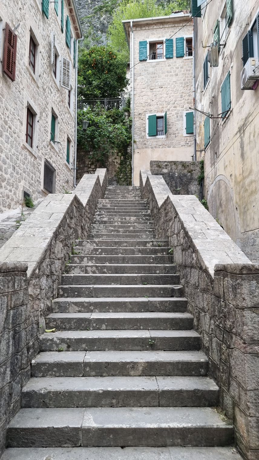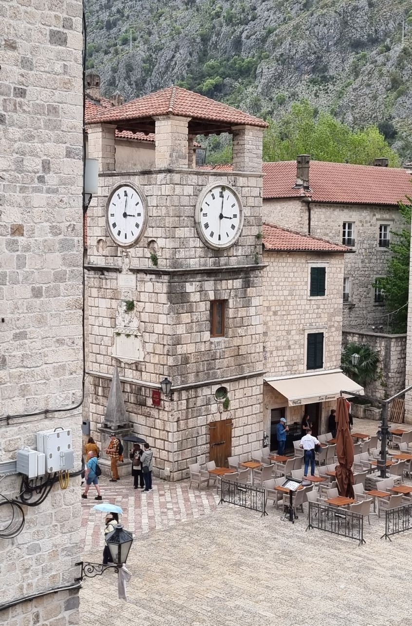 Wir gehen die Stadtmauer entlang, kommen erst dort, wo der Anstieg auf den hinter der Stadt liegenden Berg beginnt, durch das westliche Tor in die Stadt hinein. An der Stadtmauer, direkt beim Tor, geht es vorbei an einem tiefblauen Teich mit sehr klarem Wasser; an der Seite liegt ein kleines Becken, in das anscheinend fortwährend frisches Wasser nachläuft. Eine kurze Recherche ergibt, dass es eine Quelle ist, die aus dem Karstgebirge gespeist wird, und dass diese Quelle in venezianischer Zeit in das Verteidigungssystem der Stadt integriert war – Kotor gehörte ja fast vier Jahrhunderte lang zur Republik Venedig.